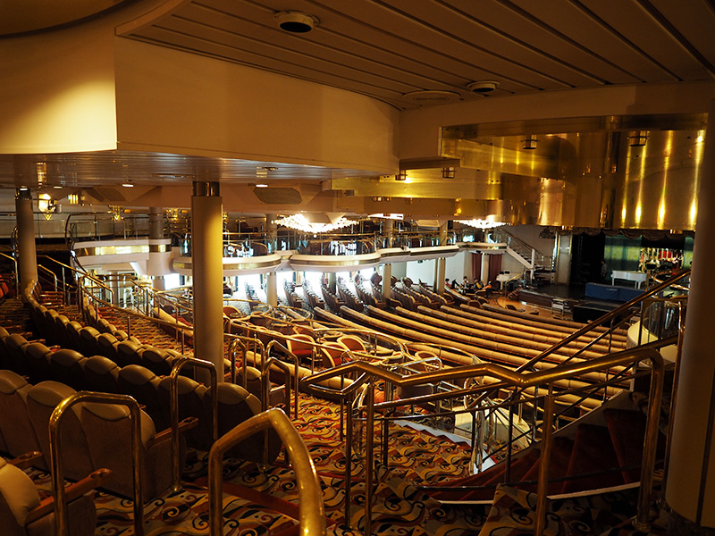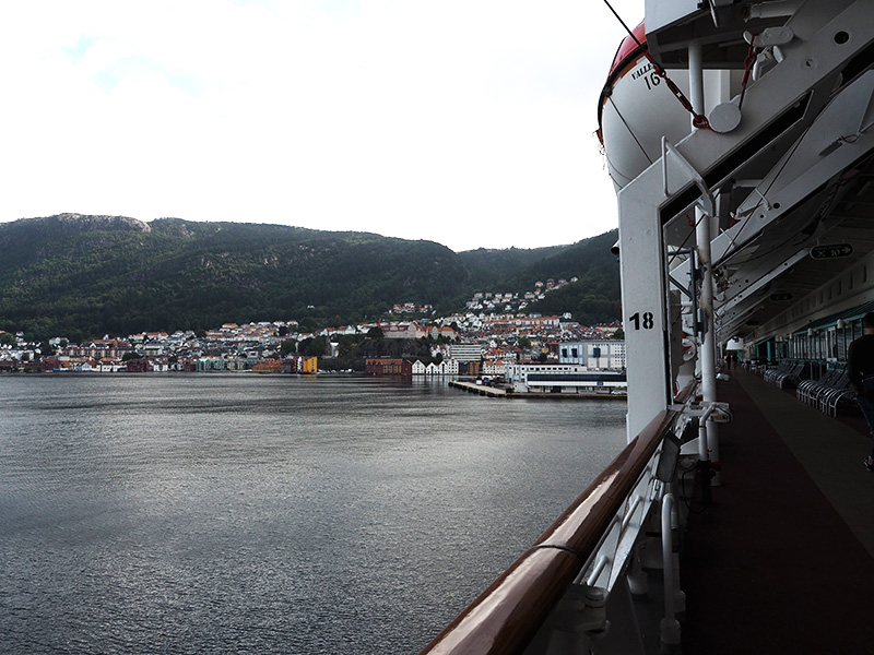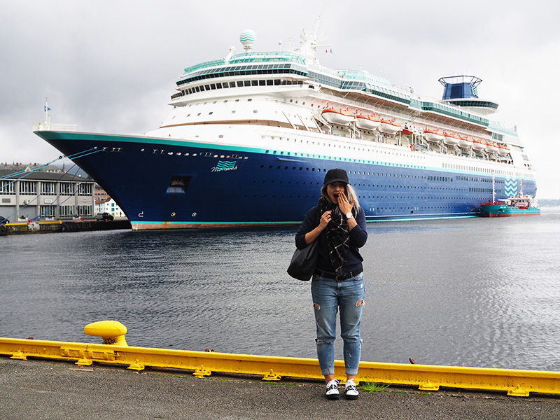 Už při výstupu z autobusu začínám mít závrať a žaludek se mi propadá tím víc, čím víc se blížíme k lodi. Normálně mám strach. Nikdy jsem tak velkou loď neviděla a první na co myslím, je samozřejmě to, jak se sakra taková věc udrží na vodě bez toho, aby se potopila. Nervózně se přibližujem, procházíme několika kontrolama a u check-inu nás příjemně rozptýlí sympatickej dredař, co nám vysvětluje fungování lodi a chvíli si s náma vykládá o Praze a tak. Do naší kajuty budeme moct až odpoledne a do oběda zbývají aspoň dvě hodiny a tak je akorát čas na to vyrazit prozkoumat jednotlivý patra. Je jich 14 a reálně mi přijde, že jich musí být mnohem víc. Na každým patře je něco, z čeho se tají dech. Už při vstupu do prvních společných prostor, kde je vidět do asi 6ti pater zároveň po sobě s Kubou šokovaně a bezhlesně koukáme a mně je v tu chvíli fakt líto, že nemám zapnutou kameru, protože ty prvotní dojmy jsou nejvíc. Běžeckej okruh a hlavně lezecká stěna mi způsobujou záchvat smíchu, protože to mi přijde fakt šílený, na lodi panebože. Ovšem fitko vítám fakt s nadšením a rovnou si s Kubou dáváme předsevzetí, že budem každej den dělat nějakou sportovní aktivitu. I když pohybu bychom asi měli dost i tak. Ono jen celou tu loď projít nám zabralo asi 3 hodiny a to jsme rozhodně nezalezli všude, kde to šlo. Každej den budeme navíc kotvit na jiným místě a mít celej den na prozkoumávání okolní pevniny, na což se strašně těším, už Bergen nám totiž učaroval a to v něm celý dva dny pršelo!