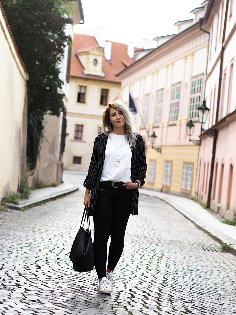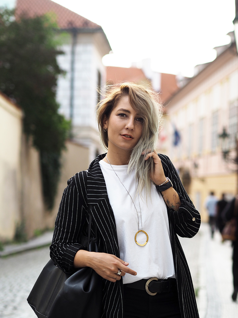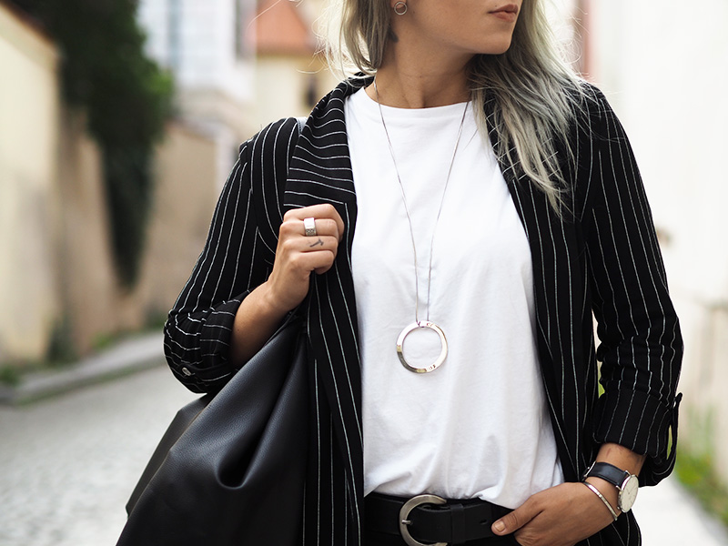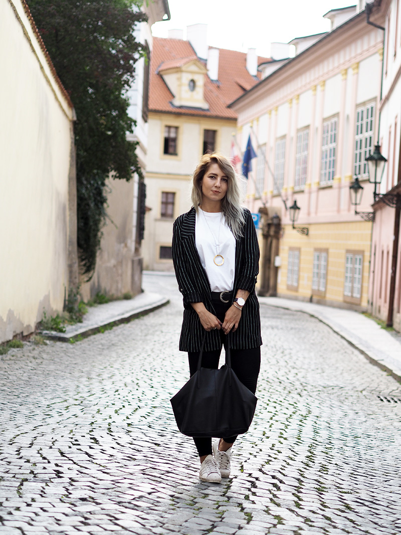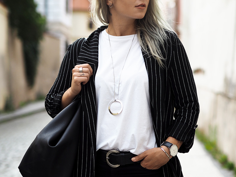 Jakoby nebudu tvrdit, že nejsou dny, kdy bych nejradši chodila do práce v teplákách nebo že nebyl den, kdy bych v něco-jako-teplákách fakt nešla. Ale co jsem se svojí pracovní rolí pořádně sžila, docela ráda tomu přizpůsobuju outfity a to i v případě, že jsem celej den v kanceláři a nejedem ani nikam na schůzku. Právě proto pak ocením kousky, který vypadaj super a zároveň jsou neskutečně pohodlný. Takový jedním kouskem je právě tohle sako, který jsem si zamilovala ve Stradivariu na první pohled, hned další den si ho vzala na sebe a pak ještě dvakrát za sebou, prostě láska. Kromě toho si pořád libuju v jednoduchosti, černý kalhoty, bílý triko (tohle z COSu je nejvíc příjemný a nejspíš si ho půjdu koupit ještě do zásoby a v dalších barvách), bílý boty, velká kabela, hodinky a výraznej náhrdelník. Ten jsem mimochodem dostala asi k dvacetinám a následující 3 roky ho na sobě měla možná dvakrát, spíš se na něj prášilo a půjčovala si ho mamka. Teď se to nějak zlomilo a nenosím v podstatě nic jinýho, tak je to asi přesně ten kousek, do kterýho musí člověk dospět, haha.