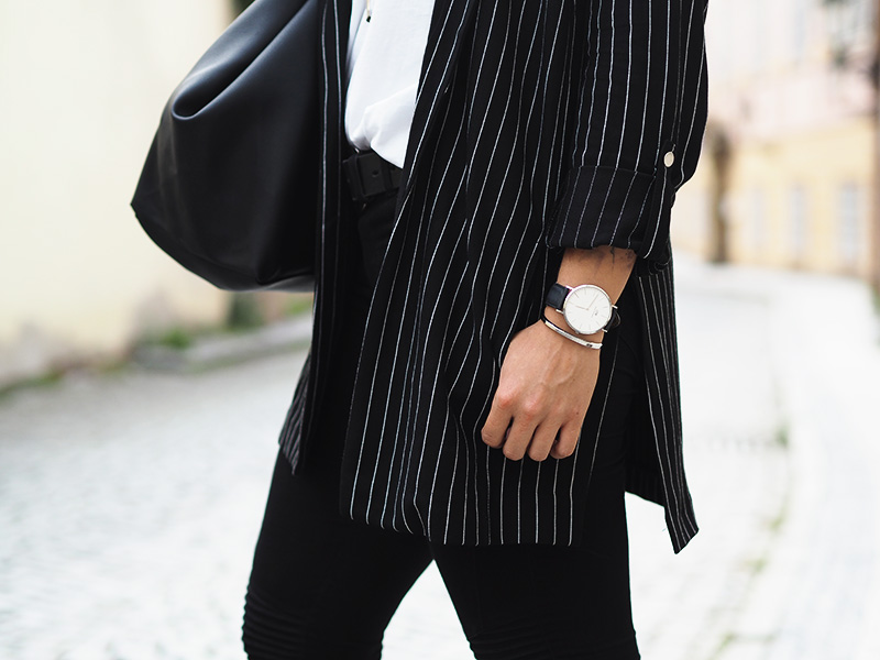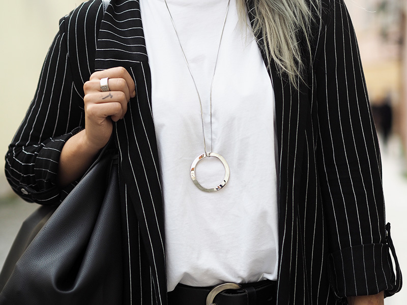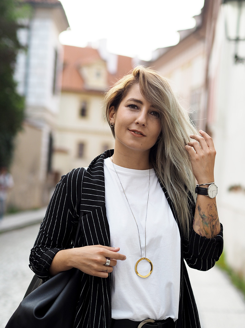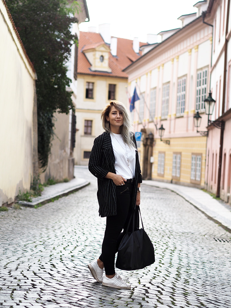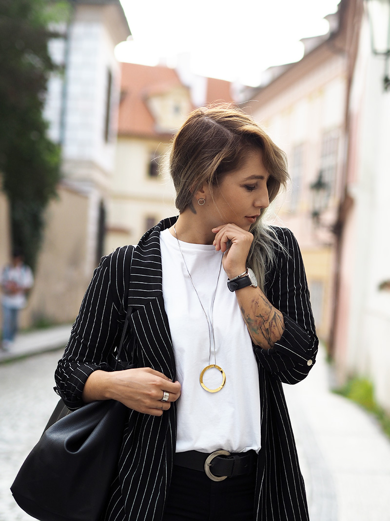 Jakoby nebudu tvrdit, že nejsou dny, kdy bych nejradši chodila do práce v teplákách nebo že nebyl den, kdy bych v něco-jako-teplákách fakt nešla. Ale co jsem se svojí pracovní rolí pořádně sžila, docela ráda tomu přizpůsobuju outfity a to i v případě, že jsem celej den v kanceláři a nejedem ani nikam na schůzku. Právě proto pak ocením kousky, který vypadaj super a zároveň jsou neskutečně pohodlný. Takový jedním kouskem je právě tohle sako, který jsem si zamilovala ve Stradivariu na první pohled, hned další den si ho vzala na sebe a pak ještě dvakrát za sebou, prostě láska. Kromě toho si pořád libuju v jednoduchosti, černý kalhoty, bílý triko (tohle z COSu je nejvíc příjemný a nejspíš si ho půjdu koupit ještě do zásoby a v dalších barvách), bílý boty, velká kabela, hodinky a výraznej náhrdelník. Ten jsem mimochodem dostala asi k dvacetinám a následující 3 roky ho na sobě měla možná dvakrát, spíš se na něj prášilo a půjčovala si ho mamka. Teď se to nějak zlomilo a nenosím v podstatě nic jinýho, tak je to asi přesně ten kousek, do kterýho musí člověk dospět, haha.