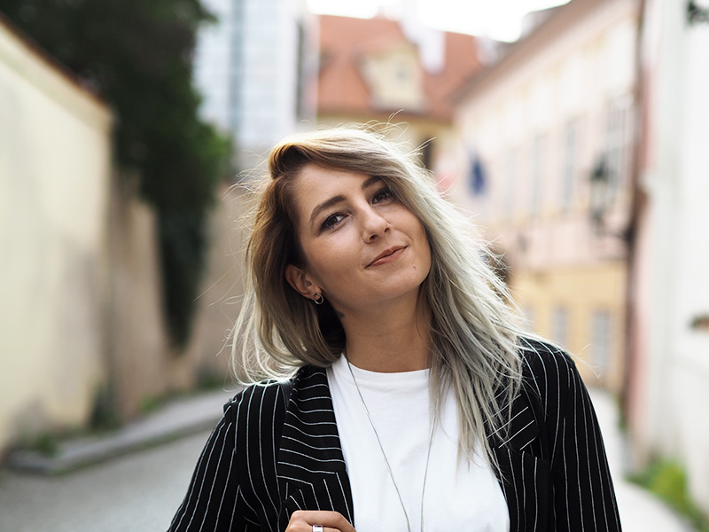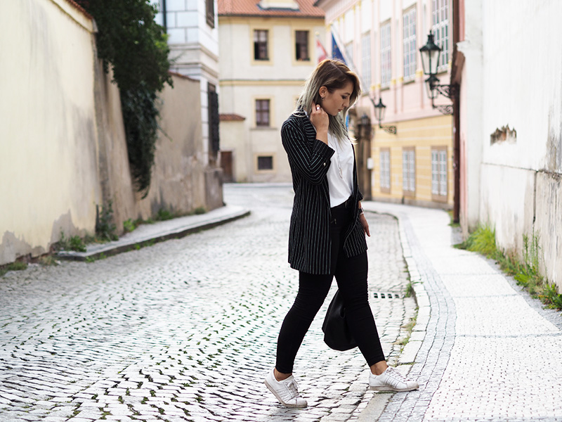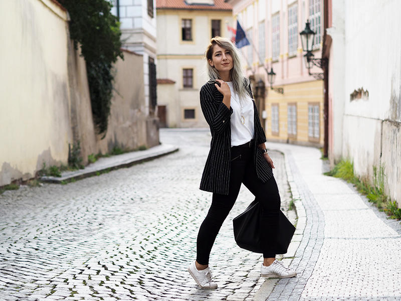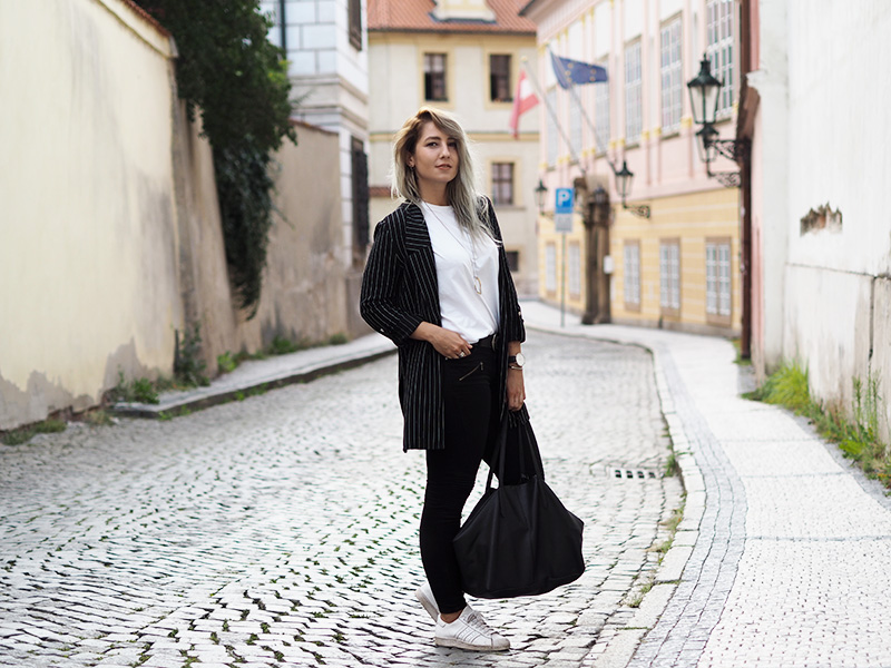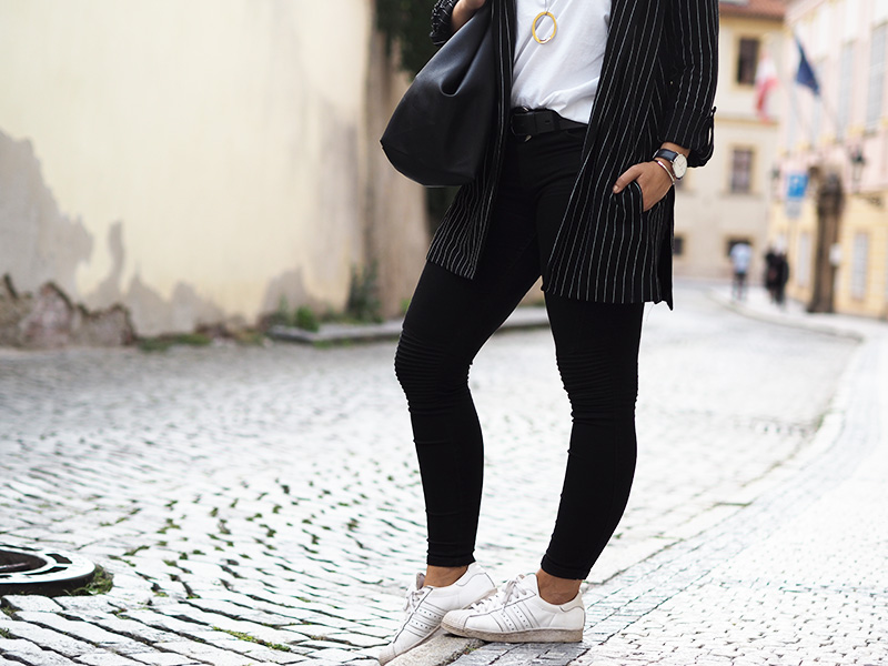 Sako – STRADIVARIUS / kalhoty – ZARA / triko, náušnice – COS / kabelka – MANGO (via Answear) / prsten, náhrdelník – CALVIN KLEIN / hodinky, náramek – DW / boty – ADIDAS