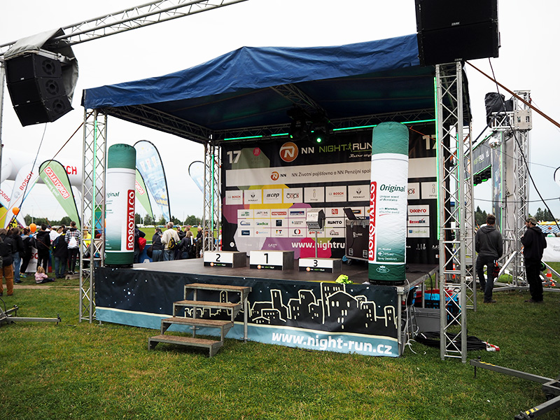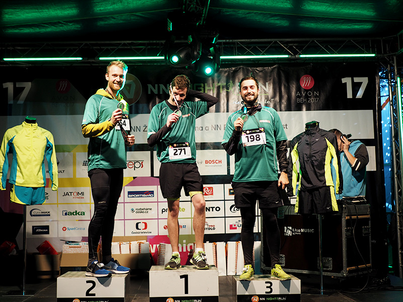 Po 40 minutách je mi krásně teplo, mám stažený fotky a za sebou dvacetiminutovej telefonát s Alex. A protože Tom měl cíl běžet pod 50 minut, vydávám se k cílový pásce a vyhlížet první závodníky. Pár jich už v cíli je, třeba náš grafik, kterej dal pro mě naprosto neuvěřitelných 41 minut. O pár minut později přibíhá Tom a než se s náma podělí o dojmy, jsme tam v plném složení. Pak už jen fotka s medailema v cíli a taky na stupních vítězů, kam nás hodní pořadatelé vpustili a můžem se rozprchnout domů.