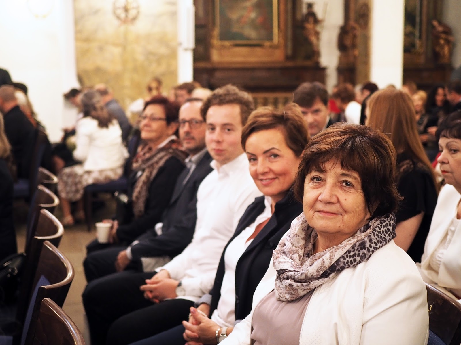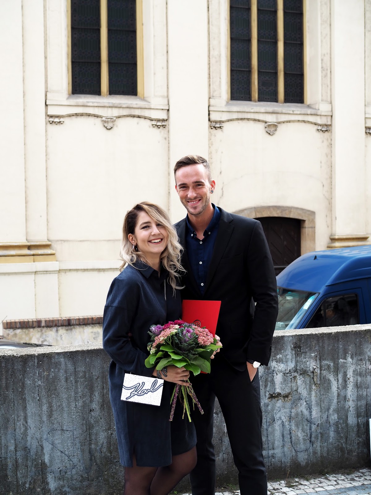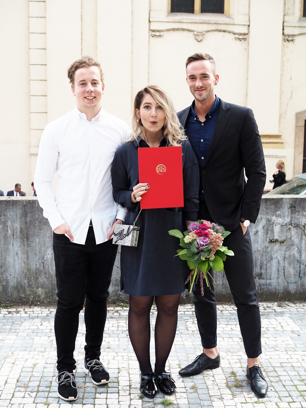 Zpráva o tom, že na magisterských mít taláry nebudem, pro mě teda byla hodně příjemná. Nic moc jsem ale opět nečekala, spíš mě děsilo, že mi přijedou naši, brácha i obě babičky, přičemž kvůli tomu museli vstávat někdy v 5 ráno. Chtěla jsem, aby to stálo za to aspoň kvůli nim. A víte co? Stálo. Bylo to naprosto skvělý. Promovali jsme v kostele svatého Šimona a Judy v Dušní ulici a kdo tam byl, tak ví, že interiér tohohle kostela je neskutečnej. Na první pohled mi tak uvnitř bylo jasný, že tohle bude něco mnohem lepšího a většího. Přiznávám, že jsem měla pěkný nervy, protože jsem se bála, že při nástupu nebo při celý události něco pokazím, nicméně naštěstí se tomu tak nestalo a všechno proběhlo jak mělo. Když jsem navíc potutelně propočítávala, jestli na mě podle zasedacího pořádku vychází červenej diplom, telelila jsem se nadšením, protože to vyšlo. Nějak jsem na to vůbec nemyslela, nepočítala s tím a helemese. Další radost byla na světě a já si pro něj pak před plným kostelem šupajdila i s bolavým kolenem jakoby mi nic nebylo a s širokým hrdým úsměvem. U proslovu rektorky i jednoho z mých spolužáků jsem měla slzy v očích a celkově jsem se tím nechala uplně unést. Občas je vážně skvělý nic neočekávat a pak být mile překvapen. Při odchodu ze sálu jsem dost možná zkazila kameramanovi závěrečnej záběr, protože když jsem šla okolo táty, nastavil mi ruku k plácnutí a já neodolala, haha.