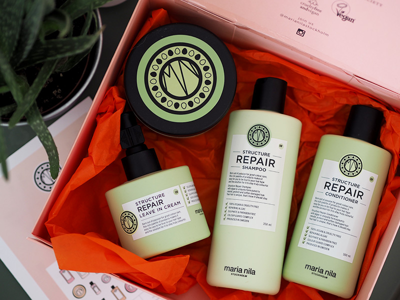 Co se týká péče o vlasy, šampony ráda střídám – mám totiž pocit, že mi nějakej chvíli vyhovuje, ale pak už si na něj vlasy zvyknout a neúčinkuje tak, jako na začátku. I proto ráda zkouším nový, převážně teda nějaký na blonďatý nebo zničení vlasy. Když se mi do rukou dostala sada Maria Nila, byla jsem na to strašně zvědavá. Maria Nila je veganská značka vlasový kosmetiky a mají právě ty znamé barevné masky, které neničí vlasy, vymývají se a vypadají super – já takhle jednou měla růžovou, jestli si vzpomínáte. No a tohle v krabici je vlasová péče – šampon, kondicionér, maska a krém. Oblíbila jsem si hlavně ten leave-in cream, kterej si při úpravě vlasů vždycky vetřu do konečnů, který se tím krásně proberou a úžasně voněj.