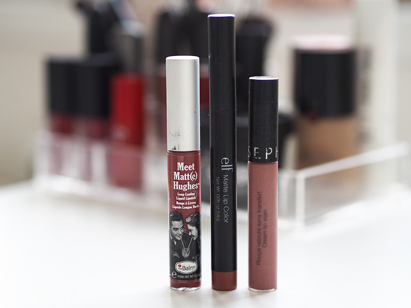 No a konečně se posouváme do kategorie, která je pro peněženku trošku únosnější. Moje 3 nejoblíbenější tekutý matný rtěnky. The Balm je all-time-favourite, je to dokonalej odstín, nevysušuje a voní mátou – používám ho skoro každý den. Elf mě dostal svým tmavším nude odstínem, kterej mi podle mě suprově sedí a opět je hrozně příjemnej na puse. Poslední favoritkou je pak matná Sephora, která má asi trilion odstínů a tahle narůžovělá nude u mě jednoznačně vede. Ve všech případech se teda dá mluvit o příjemných matných rtěnkách. Jsou i značky, co mají skvělý odstíny, ale pocitově je to šílený – za mě je tohle třeba případ NYXu – odstíny miluju a nejradši bych je měla všechny, ale na puse je v podstatě nesnesu.