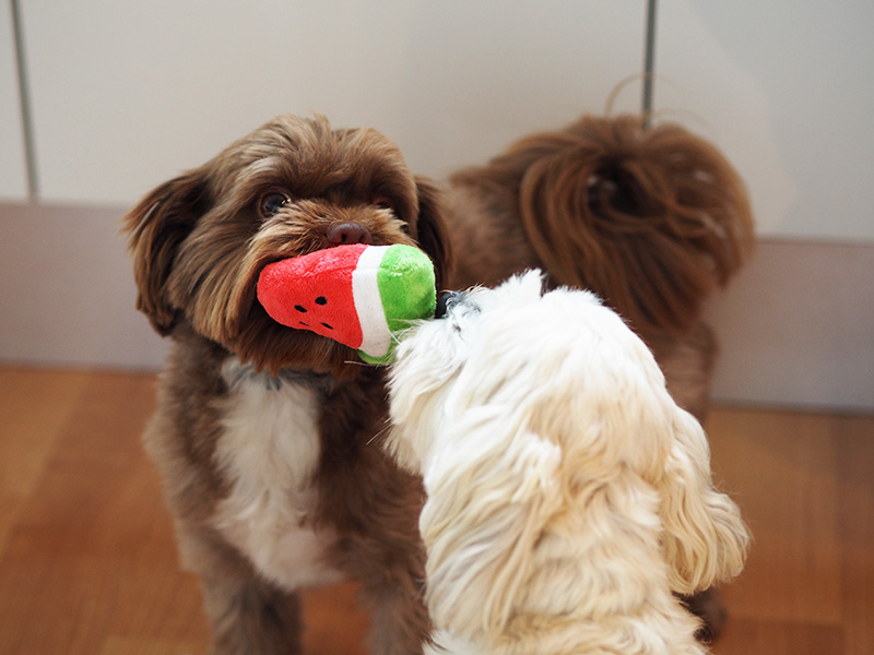 Při rozbalování mi asistoval Tobík, kterýho zajímá uplně všechno, okamžitě mi ukradl plyšovej meloun, co byl na vrchu a o chvíli později se o něj s Andym prali. Dobrot byla krabice uplně plná, některý jsme ještě ani nerozdělali, ale ty co jo, tak se setkávají s velkým nadšením. Zejména maso sušené mrazem nadchlo jak mě (protože já ujíždím na ovoci sušeným mrazem a netušila jsem, že tak lze usušit i maso), tak i oba kluky. Když jsem navíc měla krabici s věcma jen tak položenou na skříni, tak o ní oba byli neustále opření a čmuchali. Naše dojmy jsou teda jen a jen pozitivní a hlásíme, že Dogsie rozhodně stojí za vyzkoušení!