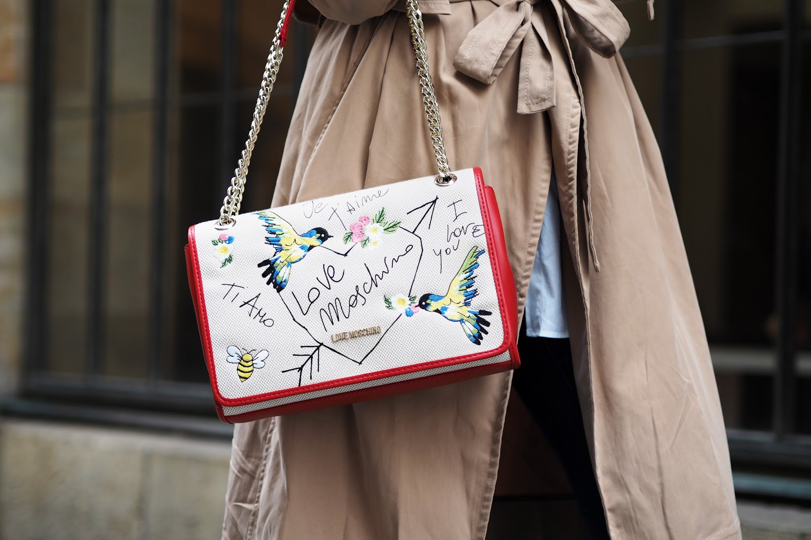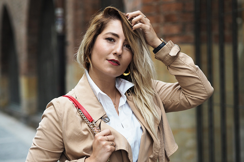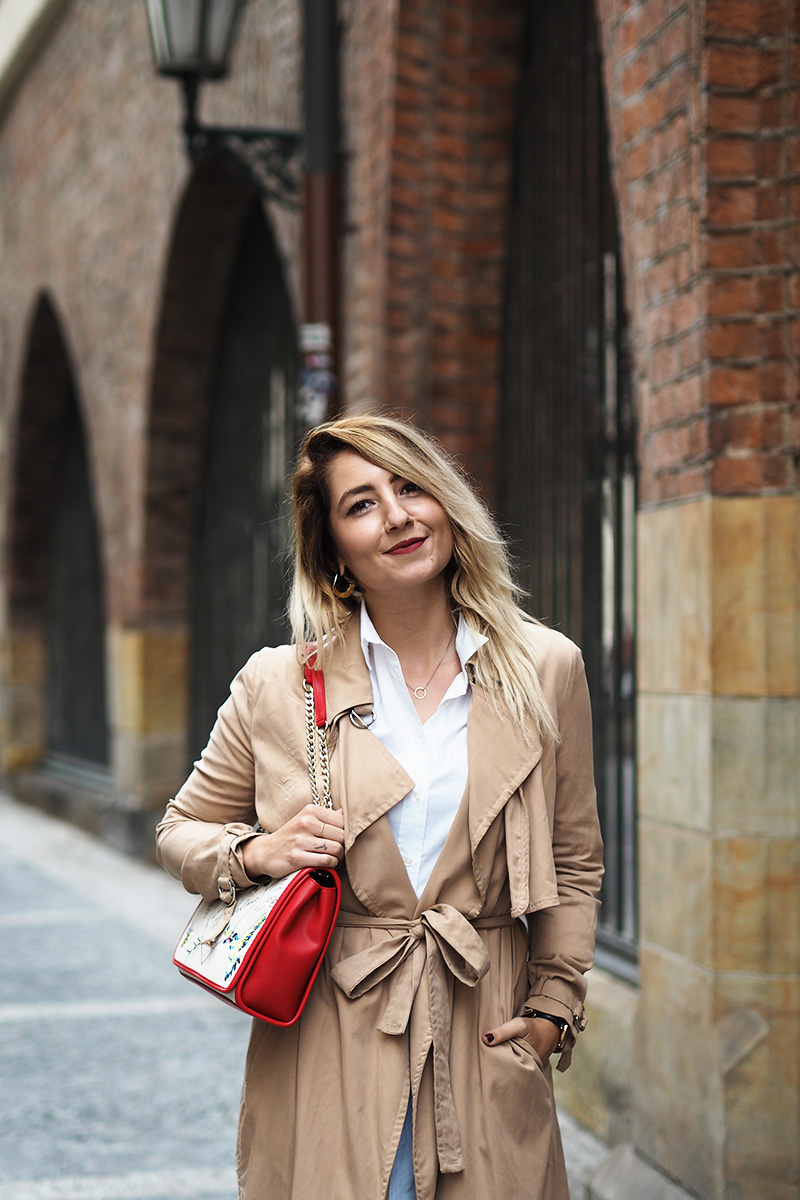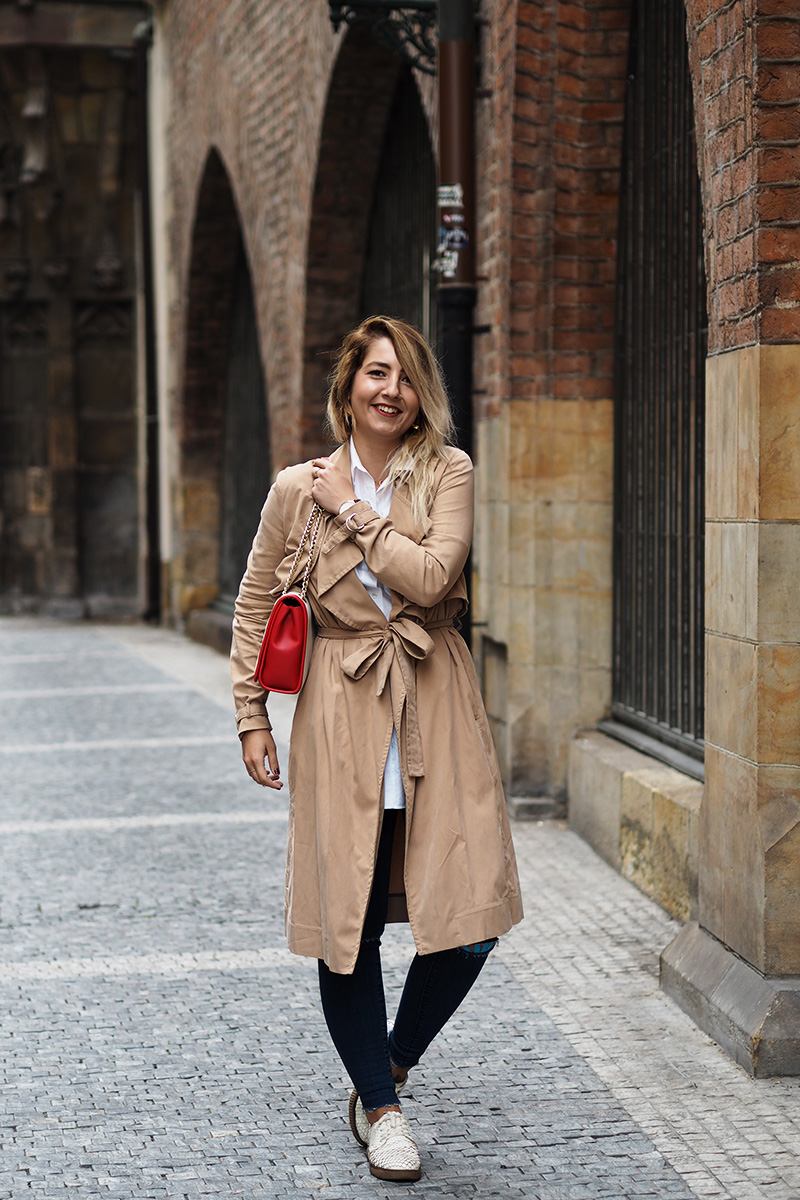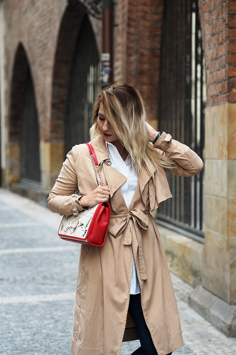 Trenchcoat – MANGO / kalhoty – ZARA / košile – GANT / boty – BAŤA / kabelka – LOVE MOSCHINO via ANSWEAR