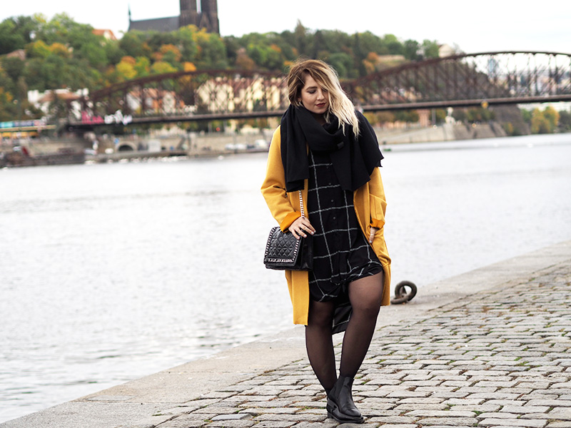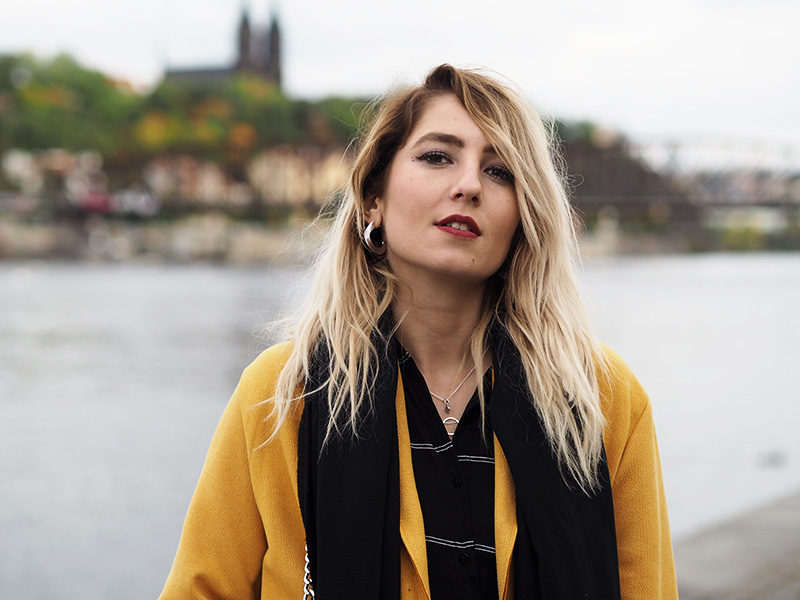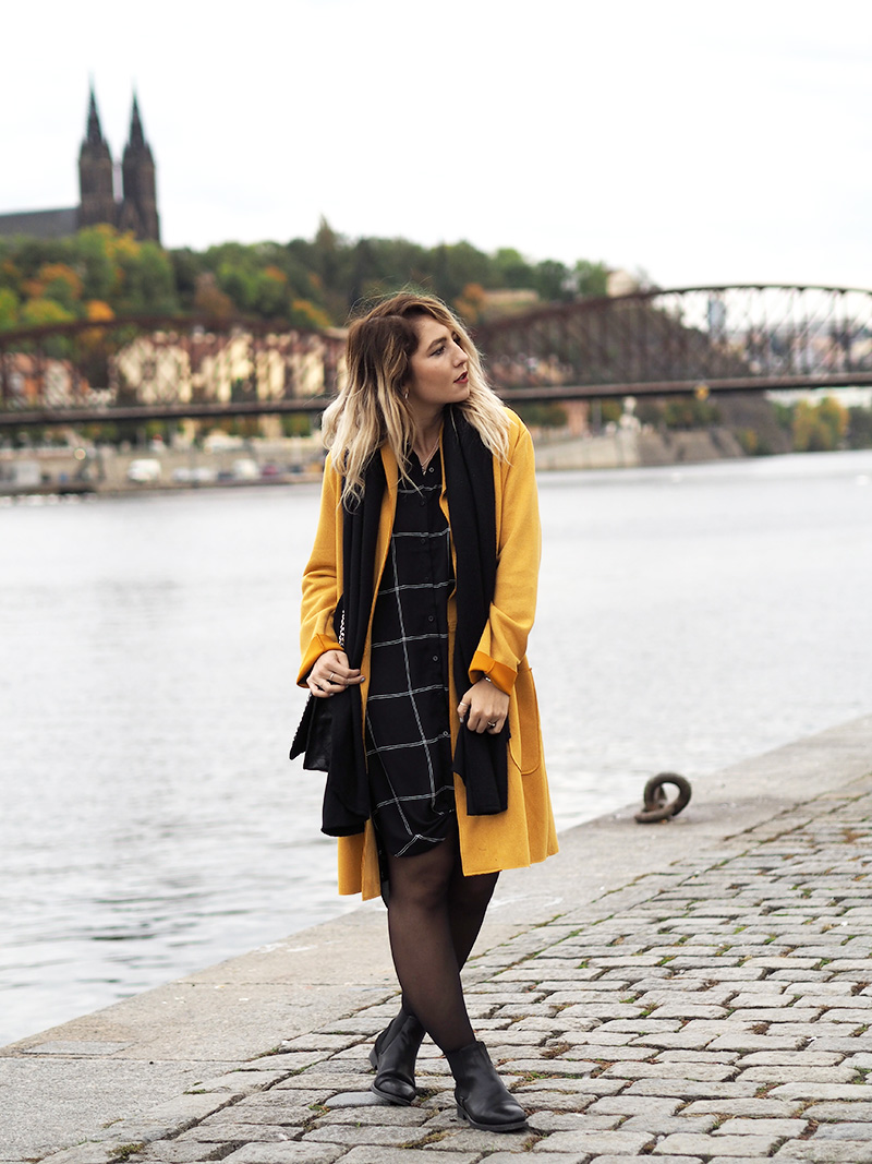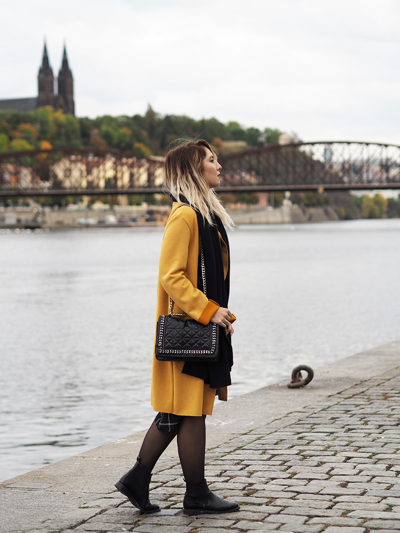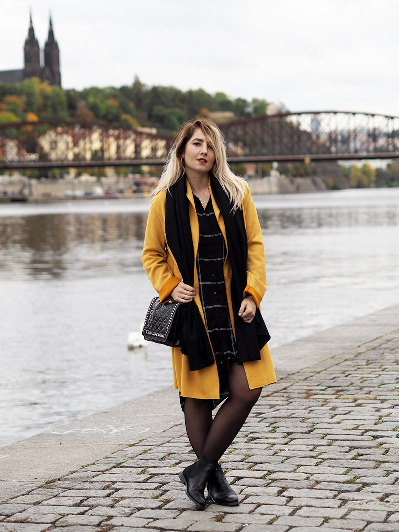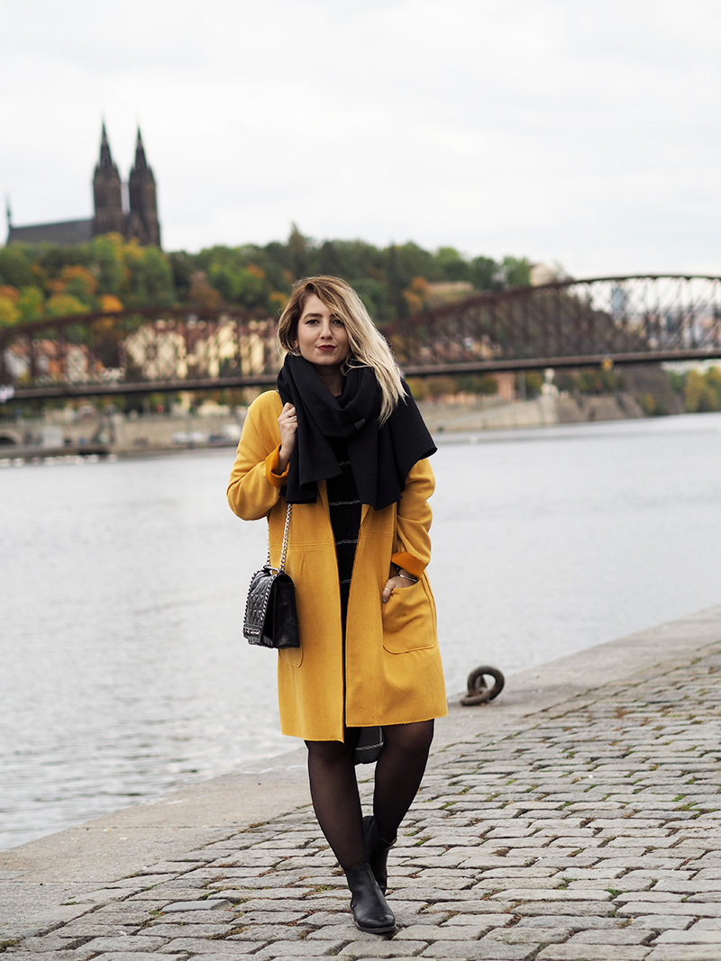 Přestože většina podzimních dnů je chladná, propršená a celkově hodně depresivní – existuje vůbec depresivnější období než podzim?! – dá se na něm i tak najít spousta pozitivního. A nemyslím tím tu klišé kombinaci vonných svíček a chlupatý deky. Myslím tím spíš těch pár dní, kdy je hezky. Barevný koruny stromů. To horký kafe (a chai latte) chutná tak nějak líp. Můžeme vytáhnout všechny oblíbený šálo-deky, co nám už pár měsíců ležej ve skříních. A trench coaty. A pořídit si nějaký nový, barevný. Třeba přesně tenhle žlutej, co jsem objevila v Zaře a trošku si nadávám, že jsem si ho nevzala ve více barvách. Tématicky k fotkám by se hodilo říct ještě třeba to, že Náplavka není plná lidí a dá se na ní fotit. Všechno je to spíš asi jen o úhlu pohledu a přestože je strašně snadný se v tom venkovním šedivu a chladnu tvářit nešťastně a poddat se každý špatný myšlence, která nám prolítne hlavou, to pravý umění je nenechat se tím strhnout. Usmát se na svět skrz průhlednej deštník nebo přes zmoklou ofinu.