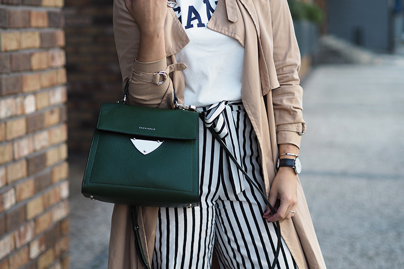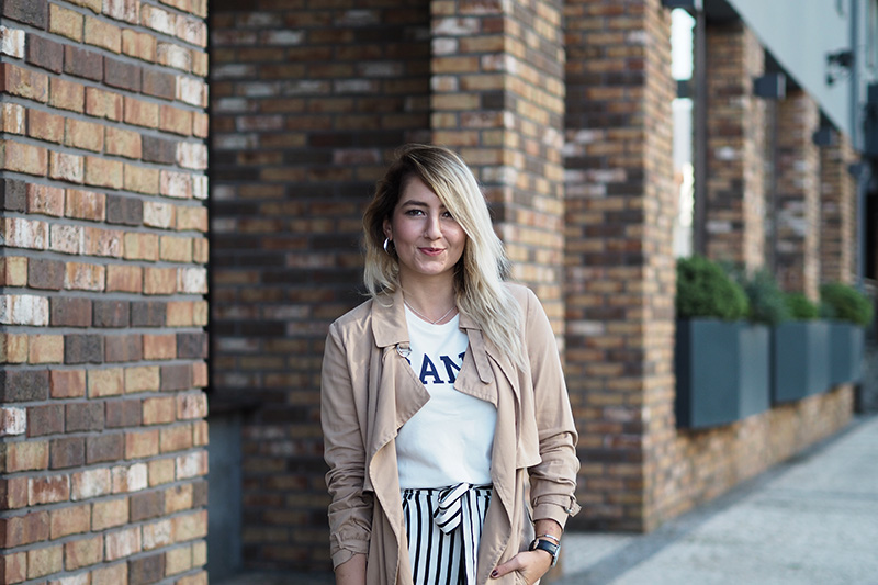 Za mě bomba a dám si to do inspo složky! 🙂 Líbí se mi, jak si z kombinovala pruhy z ikonickým trikem a nadčasový trenčkot k tomu skvělé pasuje. Kabelka je nádherná a v mé nejoblíbenější barvě ❤