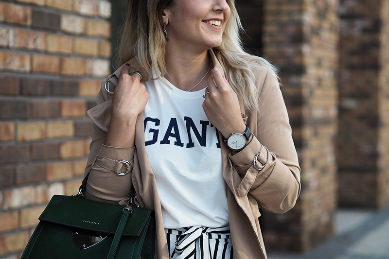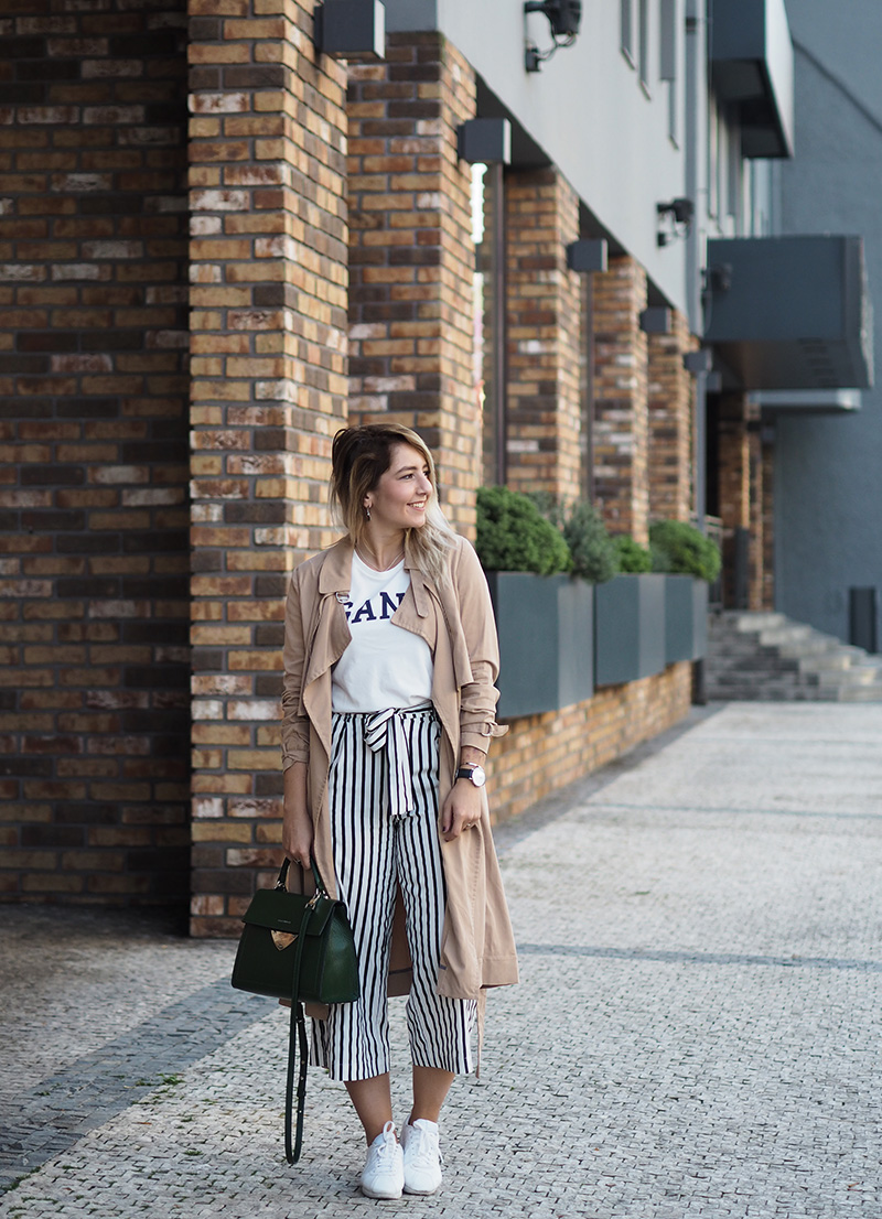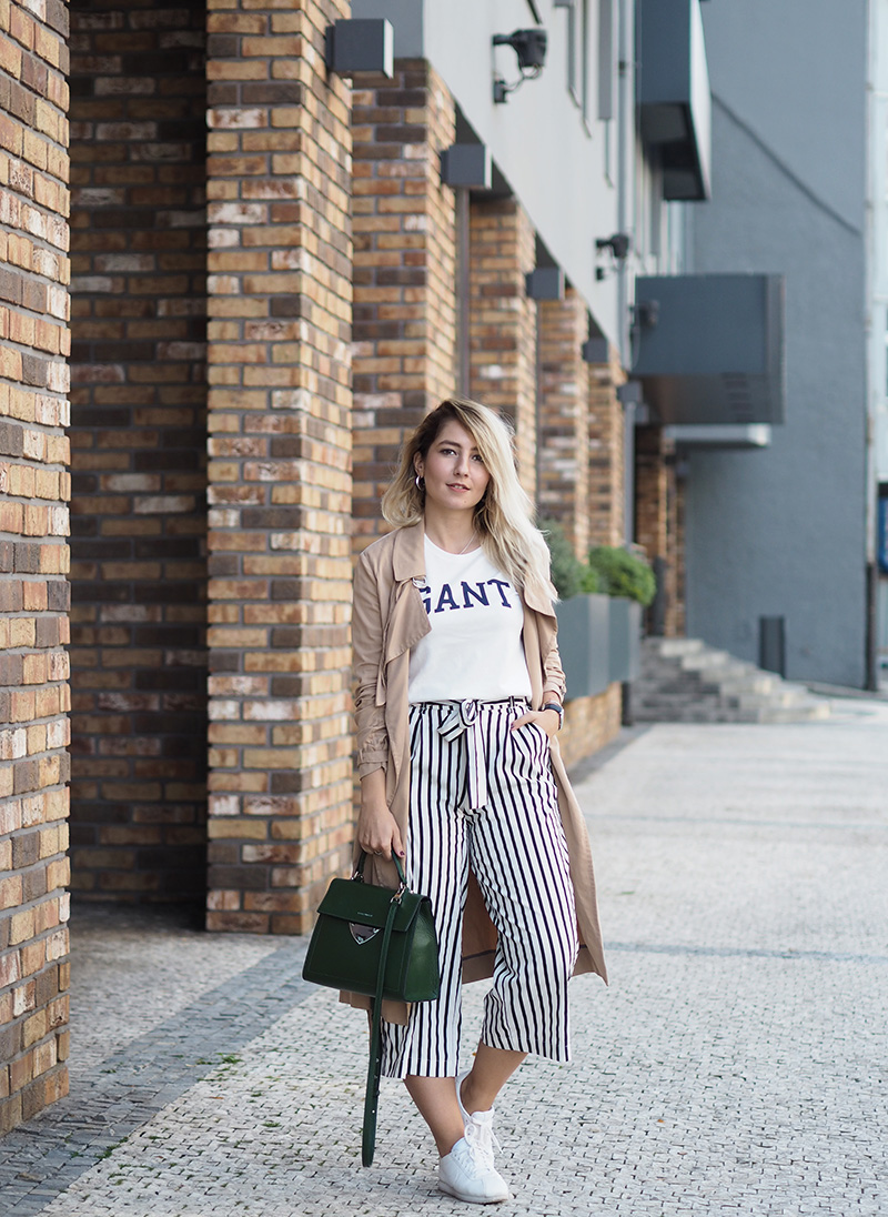 To bych nebyla já, abych tyhle svý oblíbený pyžamový kalhoty ještě naposled nevyvětrala, když se na pár dní objevilo babí léto. Uznávám, že mi v nich byla – hlavně po ráno – trošku zima, ale co. Tuhle kombinaci jsem totiž měla v hlavě pěkně dlouho, culottes, ikonický tričko Gant a dlouhej trenchcoat. Celý jsem to ještě oživila zelenou kabelkou, která se vlastně na blogu objevuje poprvé. Do Coccinelle už pár let chodím pokukovat, když si tam jde něco vybírat mamka a při poslední návštěvě jsem se zamilovala právě do tohohle tvaru a barvy. Mamka se mě sice chvíli snažila přesvědčit do červený barvy, ale nedala jsem se a jako dárek k promoci jsem si nakonec vítězoslavně odnášela tuhle zelenou krásku. A přestože jsem se po tom mamky nátlaku, že mi nebude s ničím ladit, trošku bála, jak ji unosím, tak ji tahám skoro pořád a ke všemu, protože se mi ke všemu líbí. To je výhoda šatníku plnýho tlumených barev, haha. I když i s červeným svetrem to bude vypadat super a jsem si jistá, že se to tady taky objeví. A tím bych tuhle litanii na kabelku asi ukončila – ale pochopte, je to moje první taková kabelka, tak jsem z toho nadšená a sama si šetřím na nejednu další. Tak mi dejte v komentářích vědět, jak se vám moje trochu netradiční kombinace líbí/nelíbí.