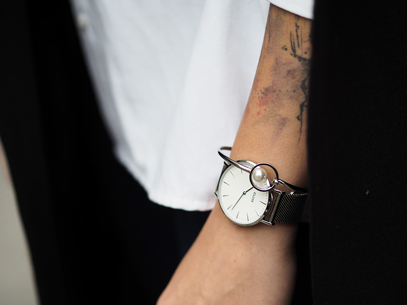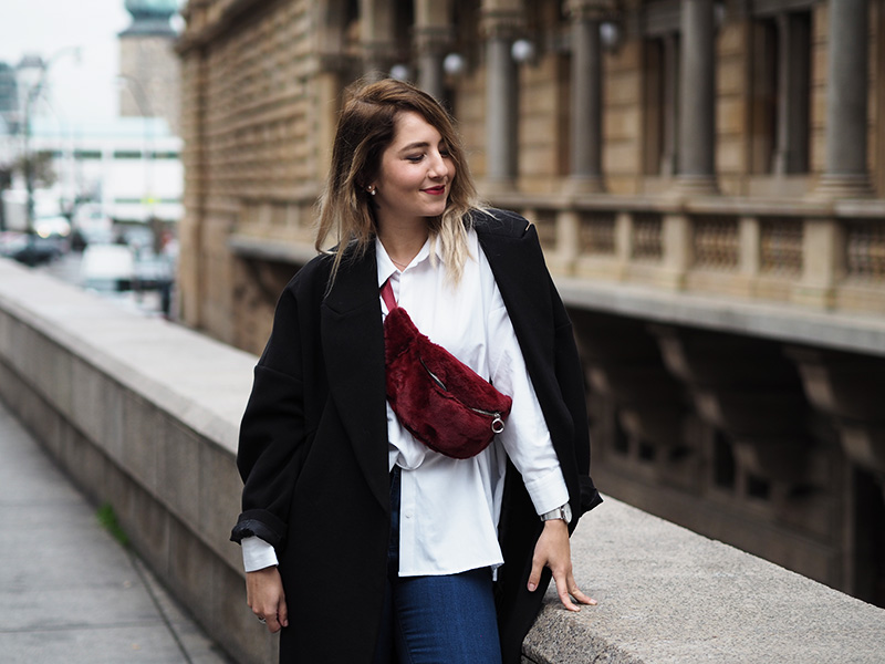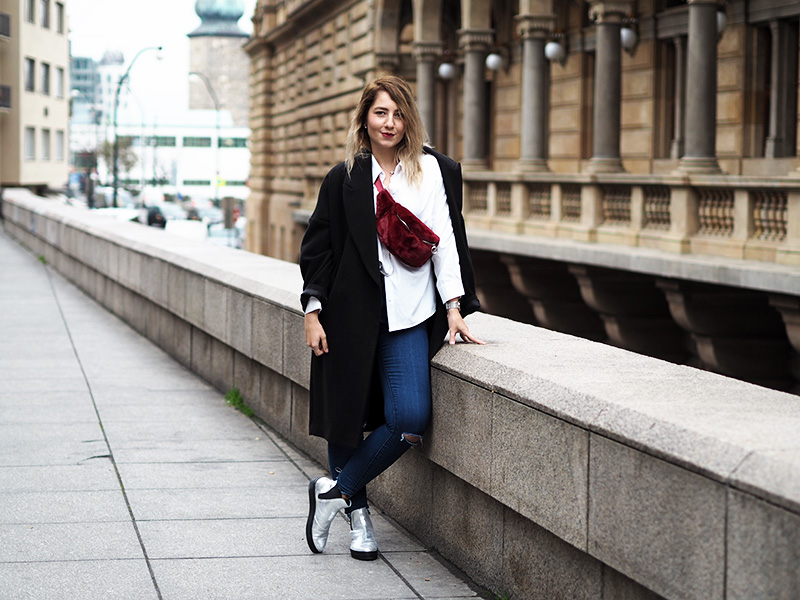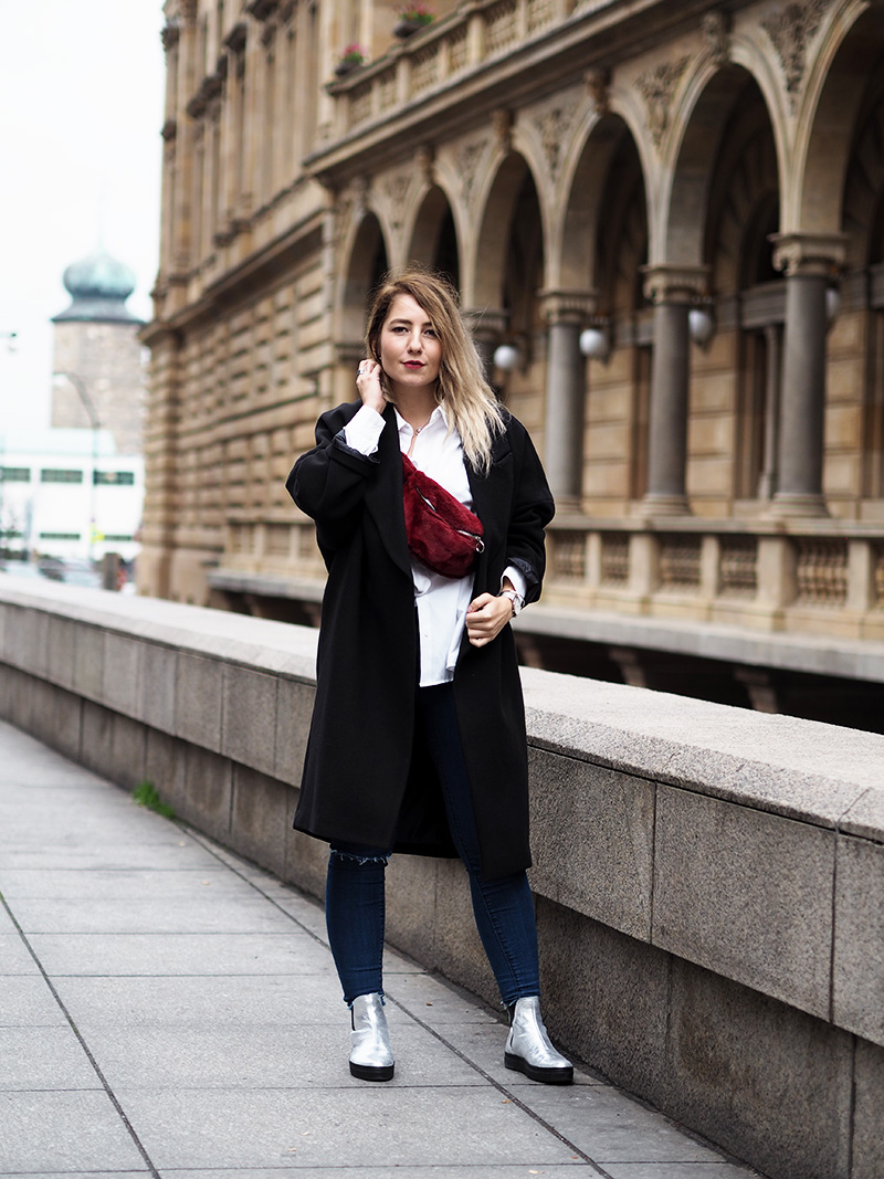 Kabát, ledvinka – STRADIVARIUS / džíny, košile – ZARA / boty – VAGABOND via ANSWEAR / náramek, náhrdelník (SKAGEN) a hodinky (CLUSE) – KLENOTY AURUM / náušnice -PANDORA
