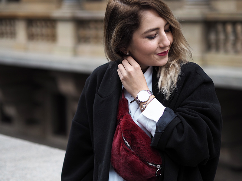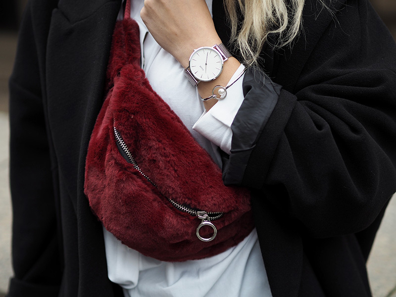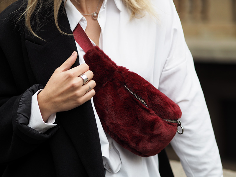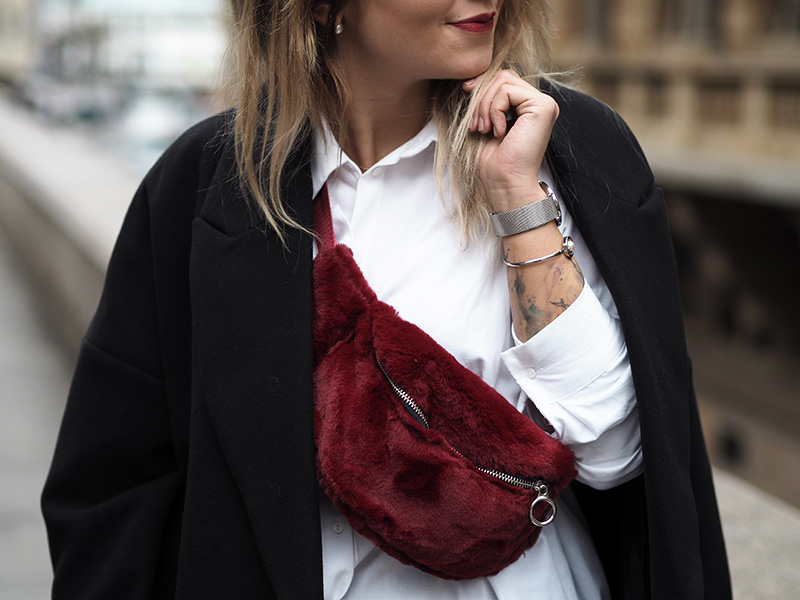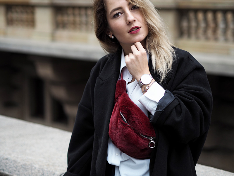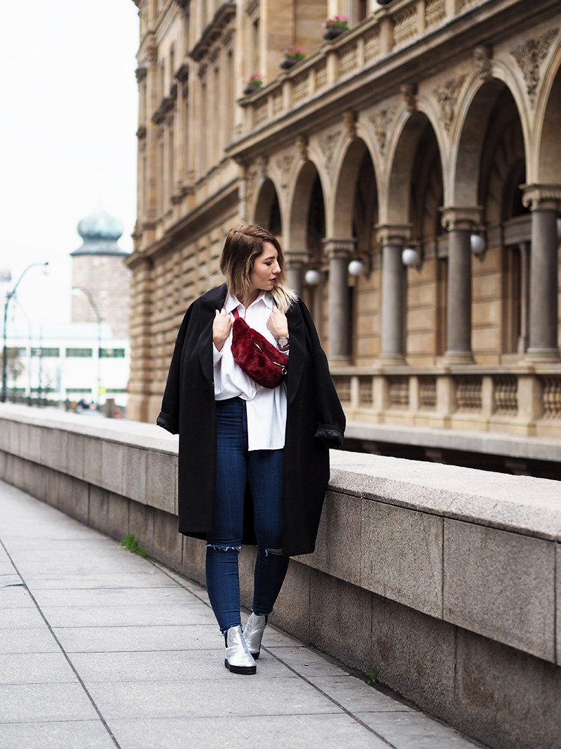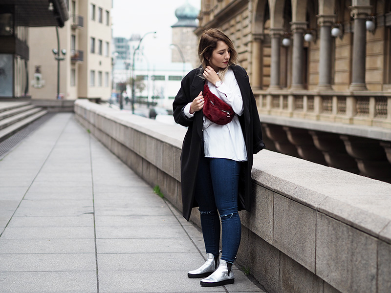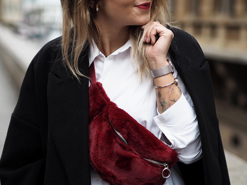 A abych se ještě vrátila k těm mým novinkám – za ledvinku se mi v práci totálně vysmáli 😀. Jak už to bývá, když přijdu v něčem nezvyklým, kolega z mýho oddělení se na tom vždycky pěkně povozí. Ledvinku mi teda hned zabavil, dal si jí kolem pasu a chodil s ní po firmě. To ovšem nemění nic na věci, že já bych jí mohla nosit každej den. Je strašně super mít uplně volný ruce, nedržet žádnou kabelku a zároveň mít na sobě něco plyšovýho, co si můžu pohladit, když je mi smutno. Nesmějte se, fakt to dělám!! Relativně nová je i oversized košile ze Zary a kabát ze Stradivaria, na kterej dostávám spoustu chvály. Vesmírný Vagabondy mám z Answearu, o kterém už byla řeč, šperky z Klenot Aurum a náušnice z Pandory. Všechno to ostatně najdete i na visačkách na některých následujících fotkách, což je nová funkce, která mě dost baví.