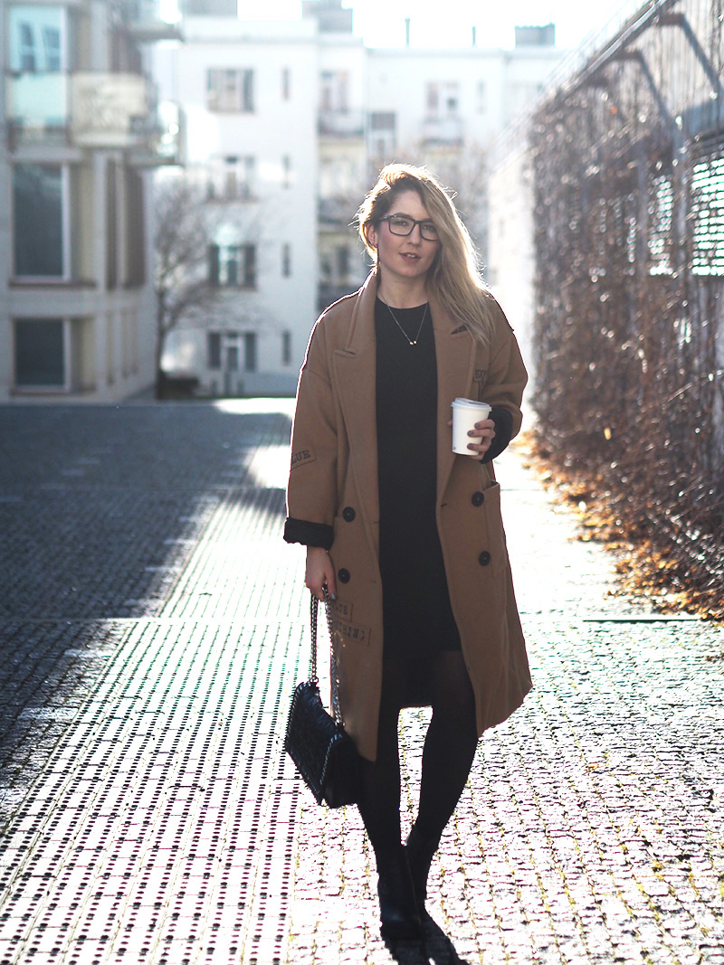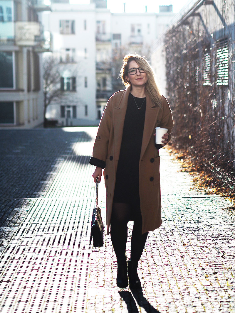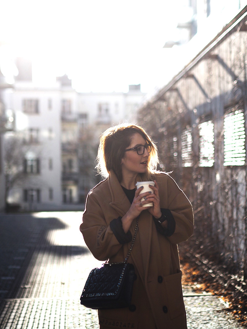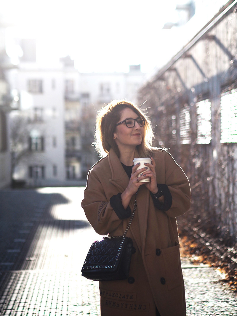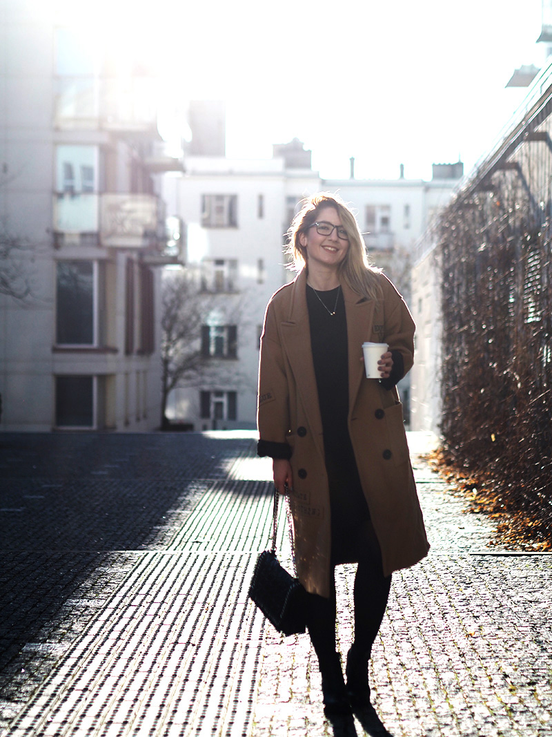 Kabát, šaty, kabelka – ZARA / boty – VAGABOND via ANSWEAR / hodinky – DANIEL WELLINGTON / šperky – CALVIN KLEIN / brýle – GRANDOPTICAL