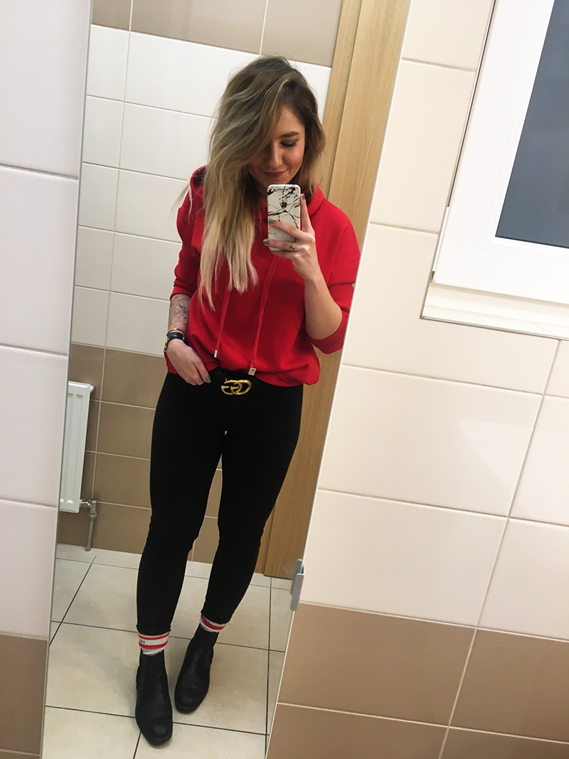 Fotit outfity zoufale nestíhám a tak jsem si zvykla občas něco cvaknout takhle v práci v zrcadle a házím vám to na Stories. A proč to nevyužít i tady, žejo. Ponožky sladěný s mikinou mi zaručily až nečekaně narvanej direct a já je teď budu asi nosit furt. Respektive si musím pořídit i nějaký jinak barevný.