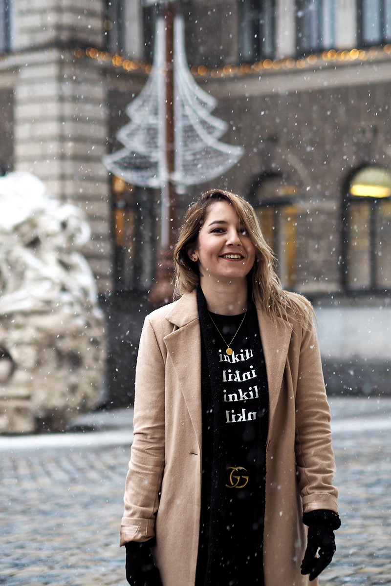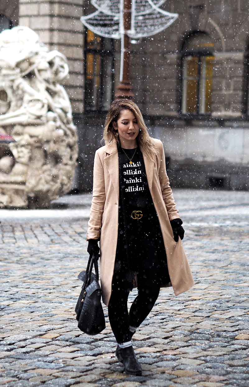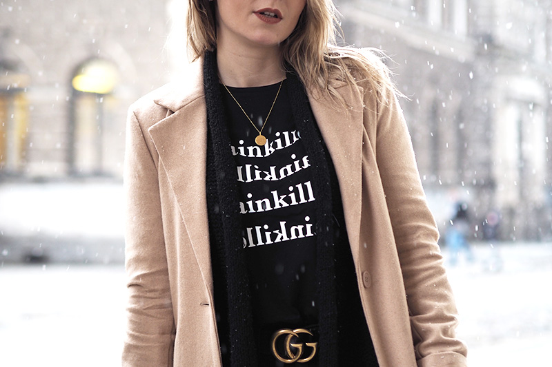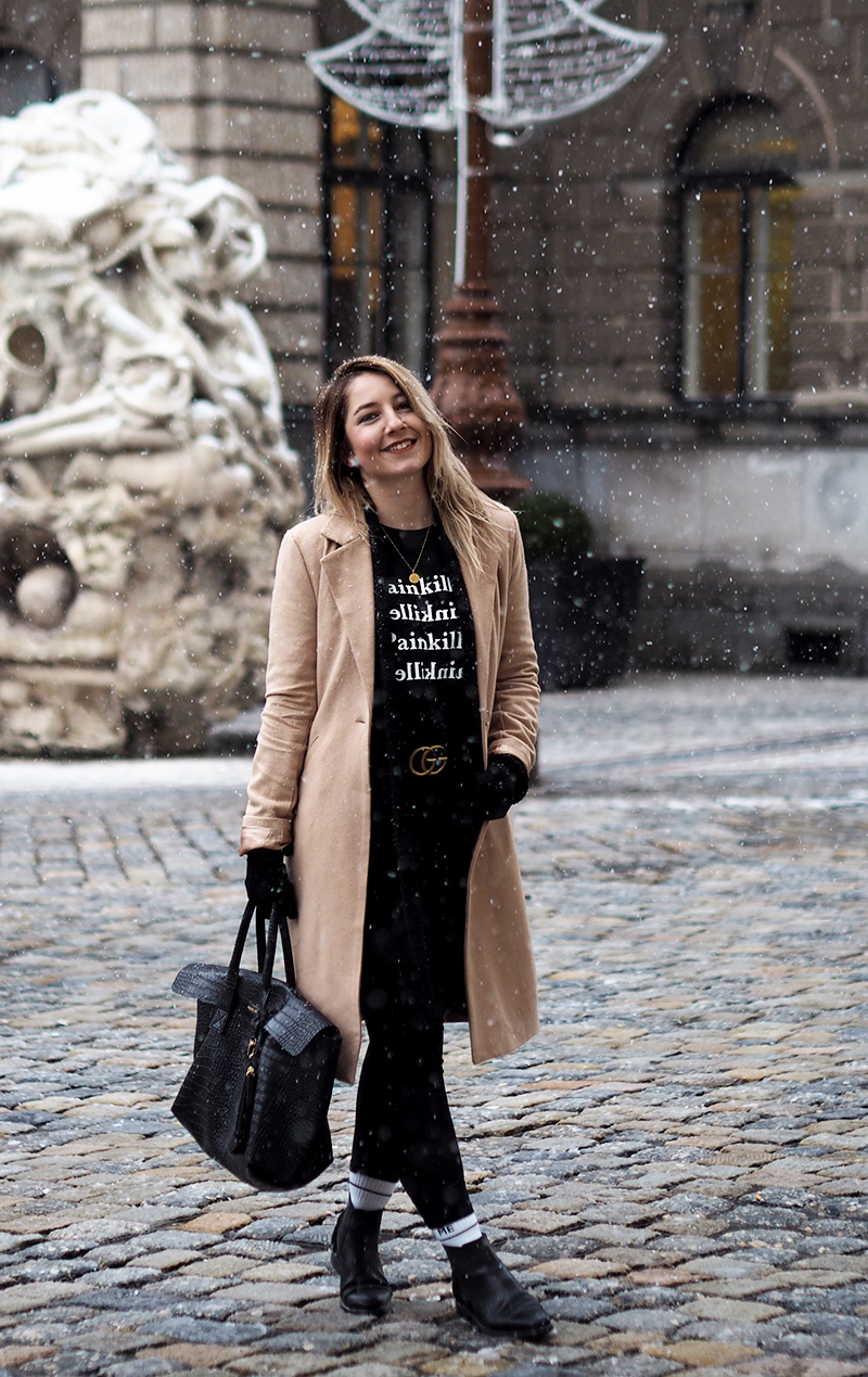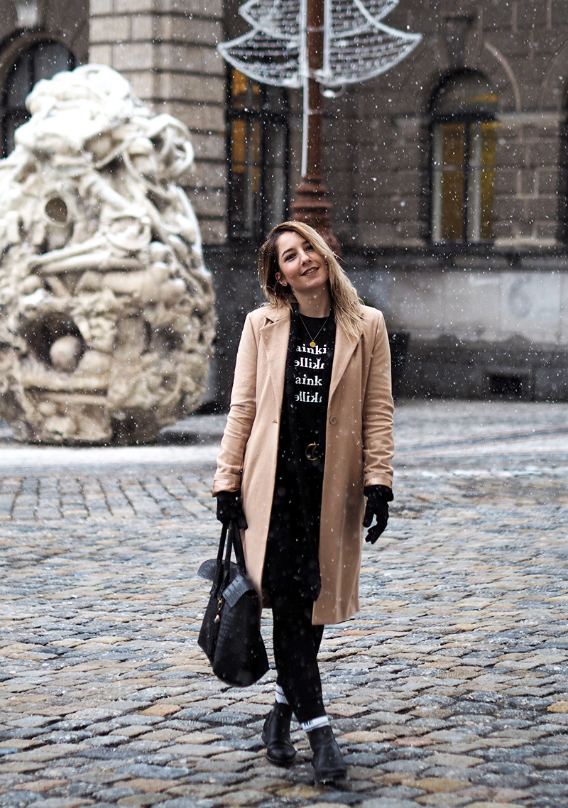 Abych se ale dostala i k outfitu, kterých teď přidávám pomálu – nemám fotografa, nedá se nic dělat – a kterej mě v kombinaci s tím sněhem fakt baví. Doopravdy jsem samozřejmě měla ještě šálodeku a čepici, přes kterou mi není vidět do očí, ale to byste toho pak z outfitu moc neviděli. Doufám, že spíš oceníte, že jsem si nechala zachumelit (a zkroutit) vlasy! 😀 Na sobě mám novej kabát a tričko z NA-KD. Ano, opět a doufám, že ne naposled. Tenhle světově populární e-shop mě fakt baví a pokud i vás, opět mám pro vás slevu, tentokrát na 20% a kód zní “dominika20cz”. Tak ho třeba využijete na nějaký odměny za zkoušky, za dodržování předsevzetí (pokud teda nemáte nějaký o šetření…) nebo jen tak pro radost. Rovně střiženej béžovej kabát je klasika, co bude stylovej vždycky a tričko s nápisama Painkiller mě asi docela logicky zaujalo. K tomu basic kalhoty, nejnošenější Gantí boty, konečně vysoký ponožky a pásek, kterej jsem si nadělala sama pod stromeček.
