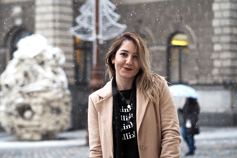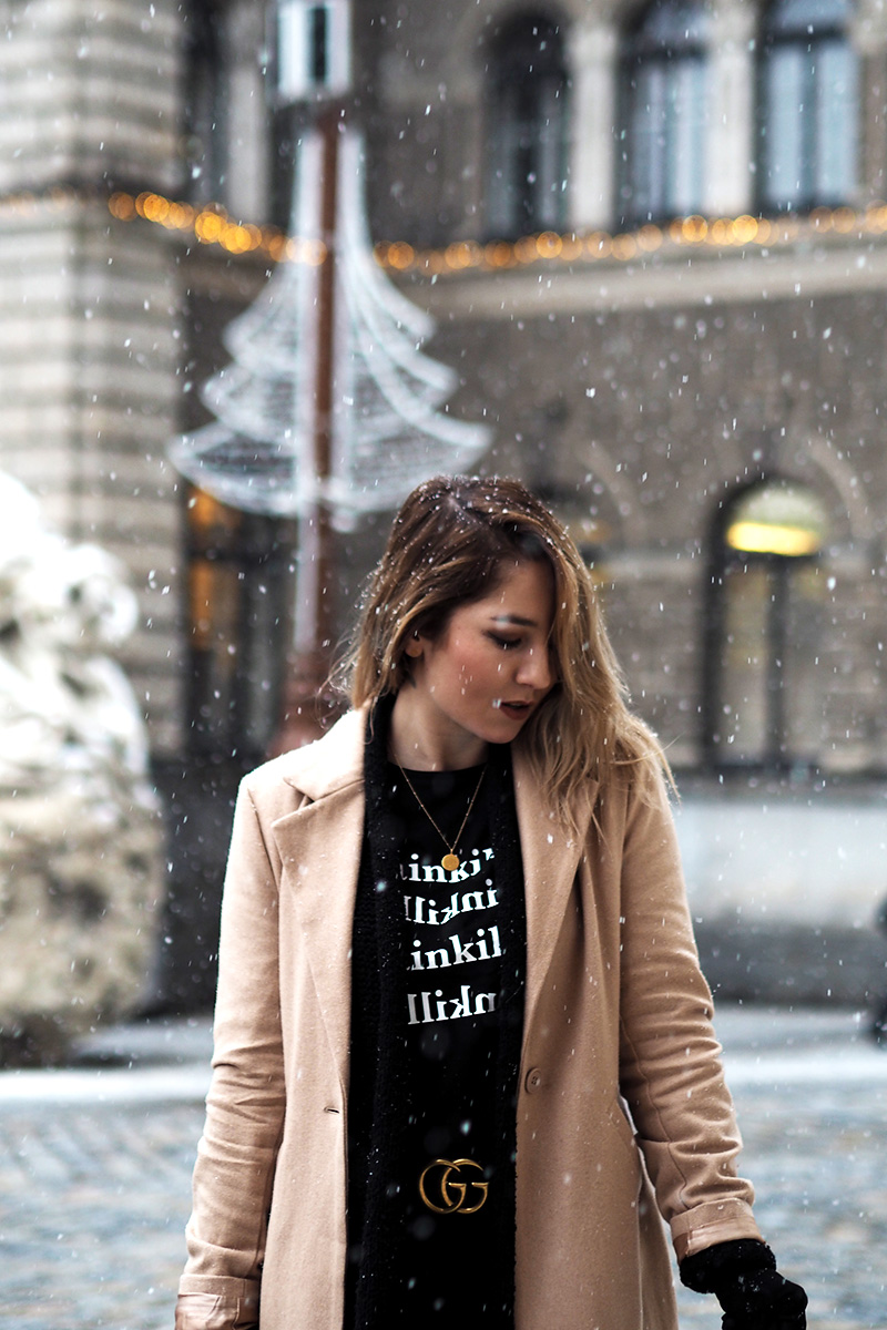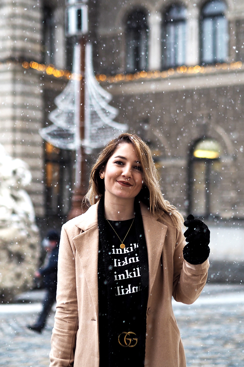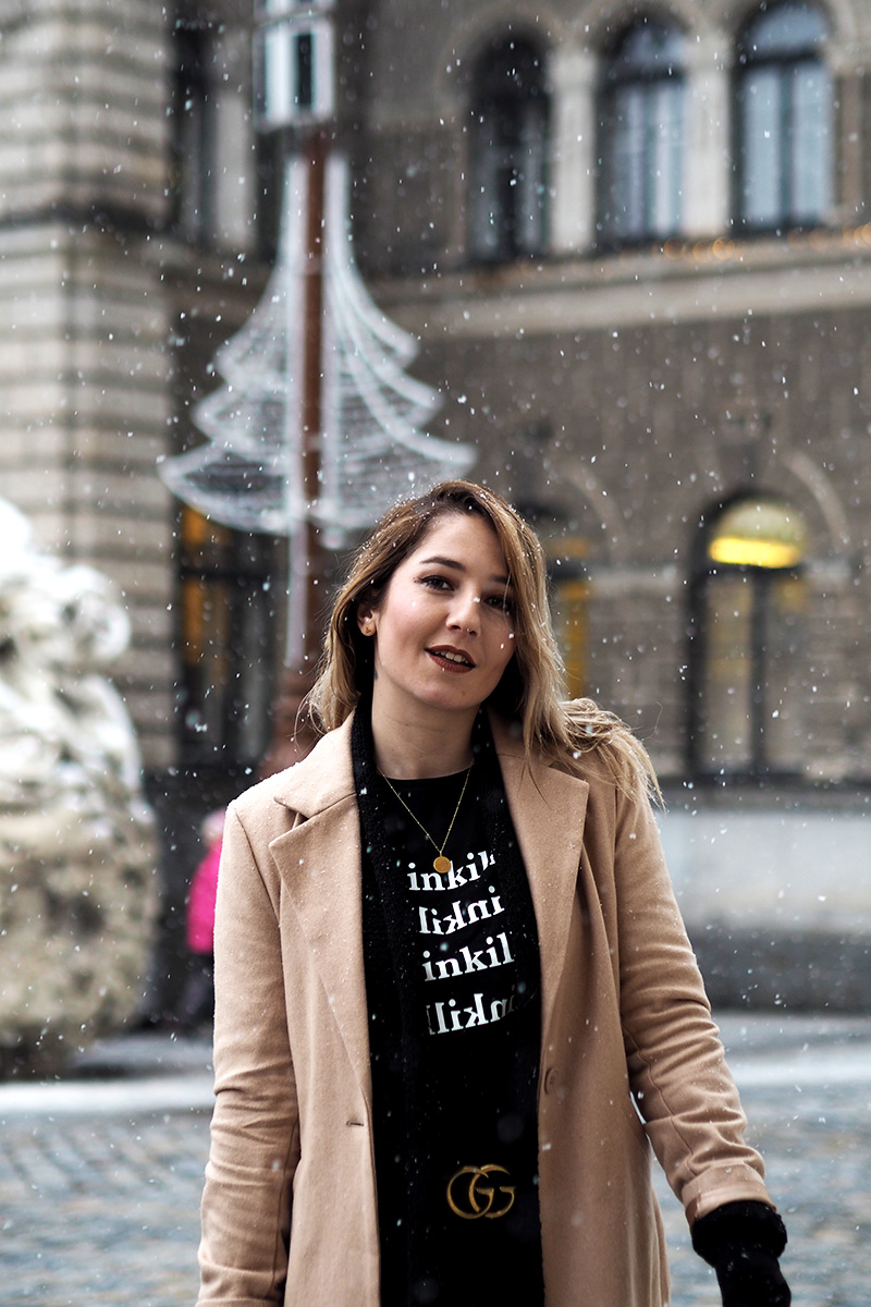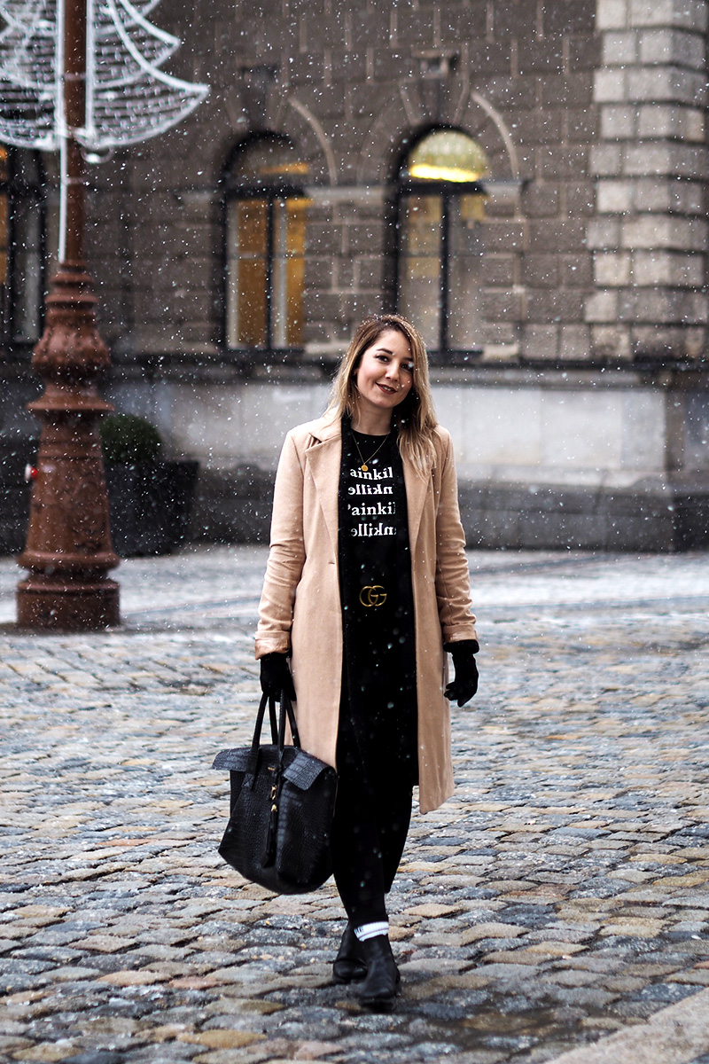 Abych se ale dostala i k outfitu, kterých teď přidávám pomálu – nemám fotografa, nedá se nic dělat – a kterej mě v kombinaci s tím sněhem fakt baví. Doopravdy jsem samozřejmě měla ještě šálodeku a čepici, přes kterou mi není vidět do očí, ale to byste toho pak z outfitu moc neviděli. Doufám, že spíš oceníte, že jsem si nechala zachumelit (a zkroutit) vlasy! 😀 Na sobě mám novej kabát a tričko z NA-KD. Ano, opět a doufám, že ne naposled. Tenhle světově populární e-shop mě fakt baví a pokud i vás, opět mám pro vás slevu, tentokrát na 20% a kód zní “dominika20cz”. Tak ho třeba využijete na nějaký odměny za zkoušky, za dodržování předsevzetí (pokud teda nemáte nějaký o šetření…) nebo jen tak pro radost. Rovně střiženej béžovej kabát je klasika, co bude stylovej vždycky a tričko s nápisama Painkiller mě asi docela logicky zaujalo. K tomu basic kalhoty, nejnošenější Gantí boty, konečně vysoký ponožky a pásek, kterej jsem si nadělala sama pod stromeček.