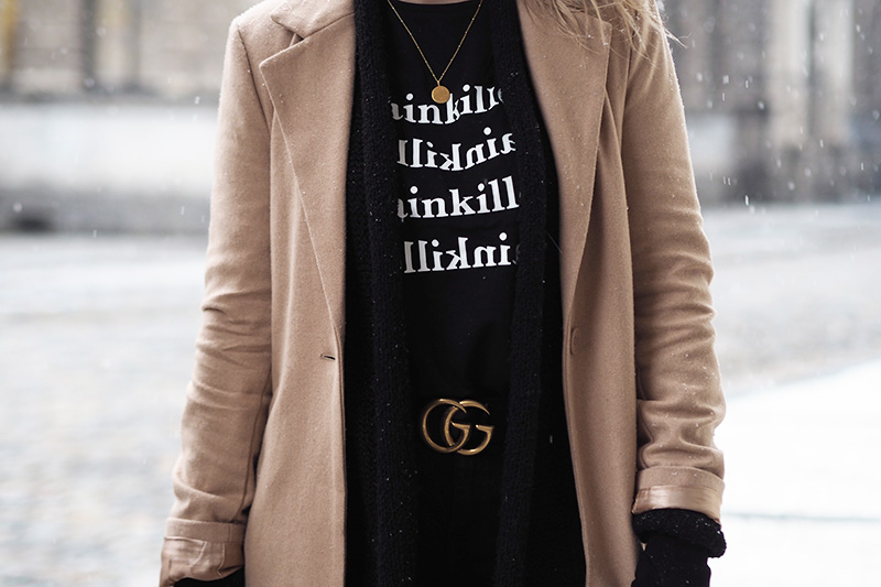 Kabát – NA-KD / svetr – TEZENIS / triko – NA-KD / kalhoty – TOPSHOP / pásek – GUCCI / kabela – POMIKAKI via FASHION PLANET / boty – GANT / ponožky – ANSWEAR / šperky – MOOYYY