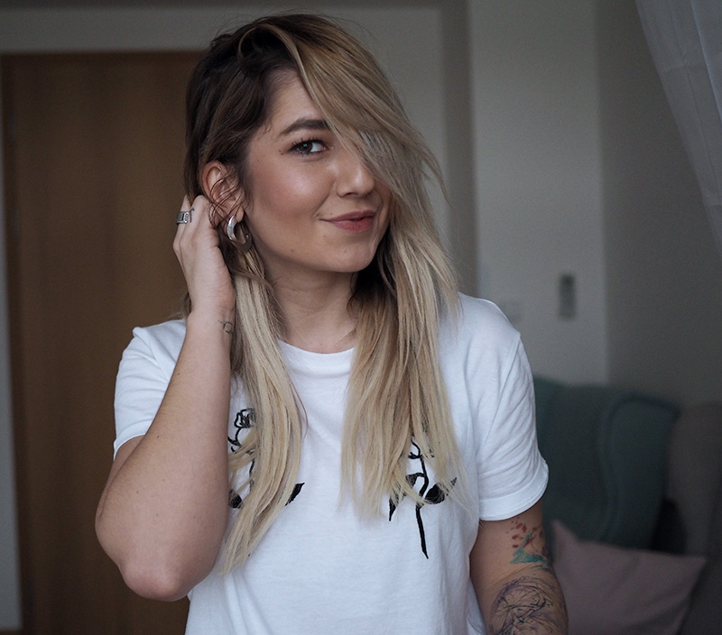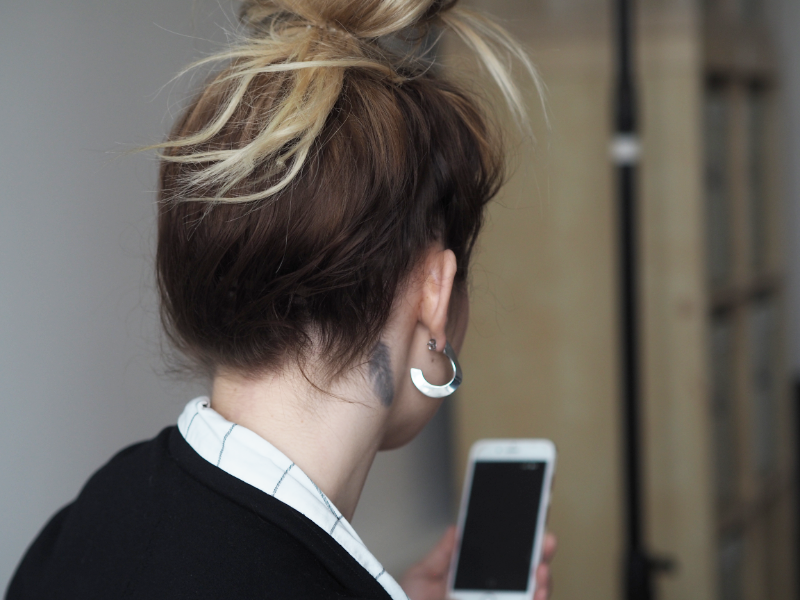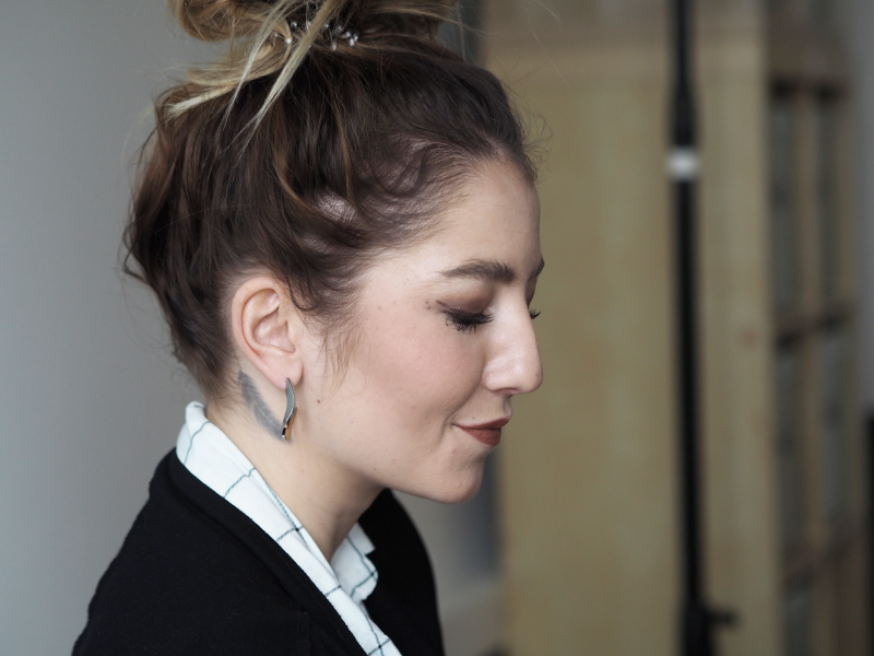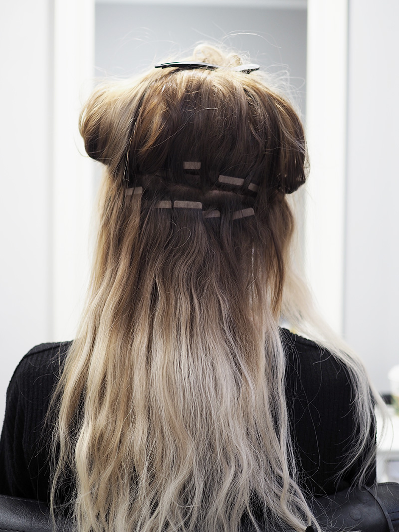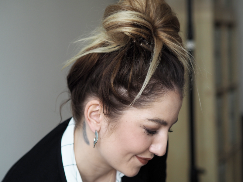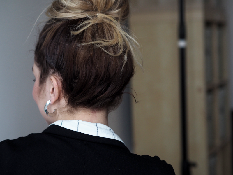 Co se týká nošení vlasů nahoru, je to taky naprosto v klidu. Samozřejmě v případě, že to máte dobře nasazený, proto doporučuju využít služeb salonu, kde to uměj a opravdu to stojí minimum. Viděla jsem i případy, kdy to i v rozpuštěných vlasech bylo vidět na první pohled a bylo to strašný, protože si to člověk nasazoval sám (?!). Tenhle drdol jsem smotala bez zrcadla v práci v ateliéru, abych vám to rychle cvakla a mohla tenhle článek konečně vydat. Neměla jsem teda možnost se s tím nějak piplat a ve finále to ještě líp ukazuje, že ty pásky vidět nejsou. Normálně si s tím ale dám víc práce a ty spodní vlasy radši zafixuju pinetkama, protože je mám kratší a kdyby mi z tý gumičky vylítaly, tak pak ta spodní linie pásek vidět byla.