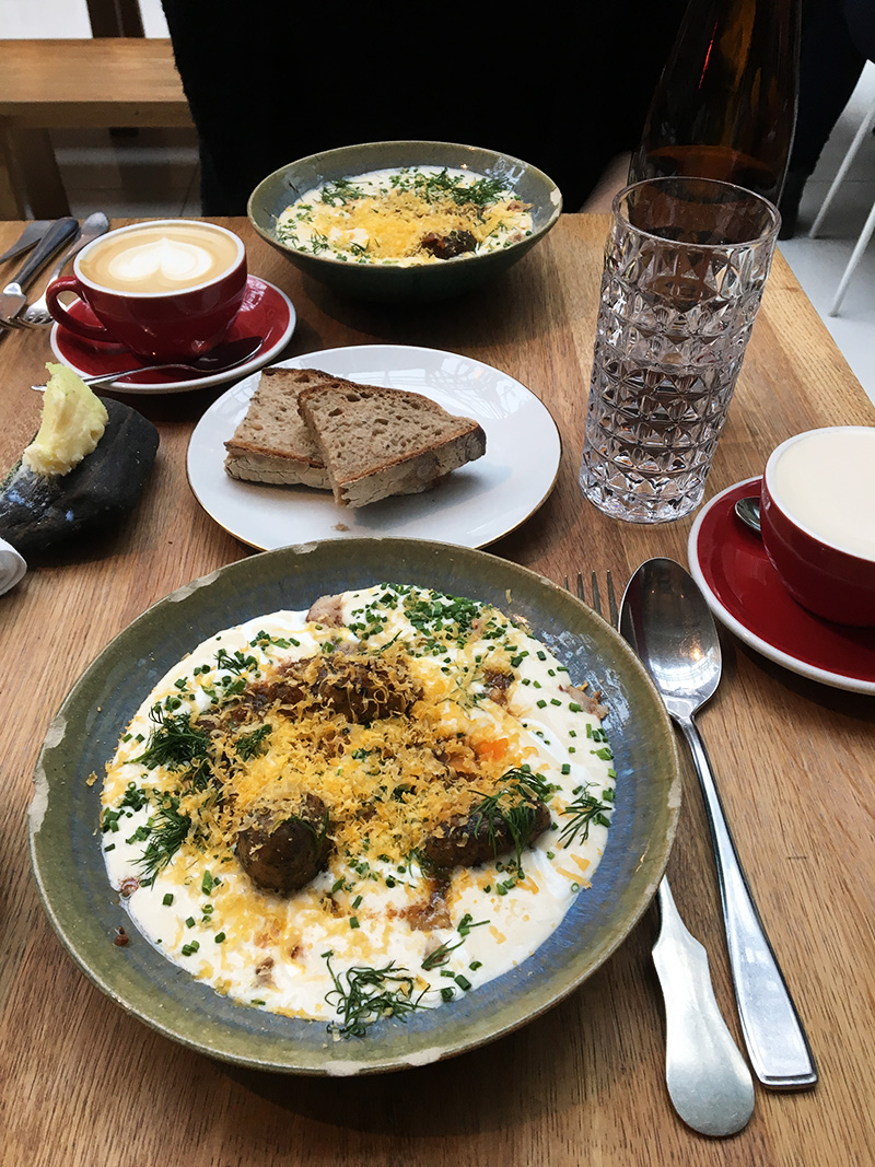 Pak jsem tam vyrazila znova a konečně zkusila něco jinýho. Vývar byl nejlepší, jakej jsem kdy jedla – přísahám – ale třeba chleba s máslem mi chutná víc než ten s vajíčkovou pomazánkou.