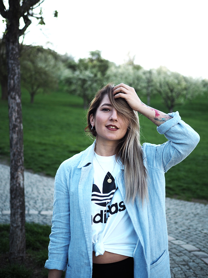Vlasy zas na chvíli ve studeným odstínu a novej nejmilovanější kus oblečení – lněnej světle modrej kabátek.