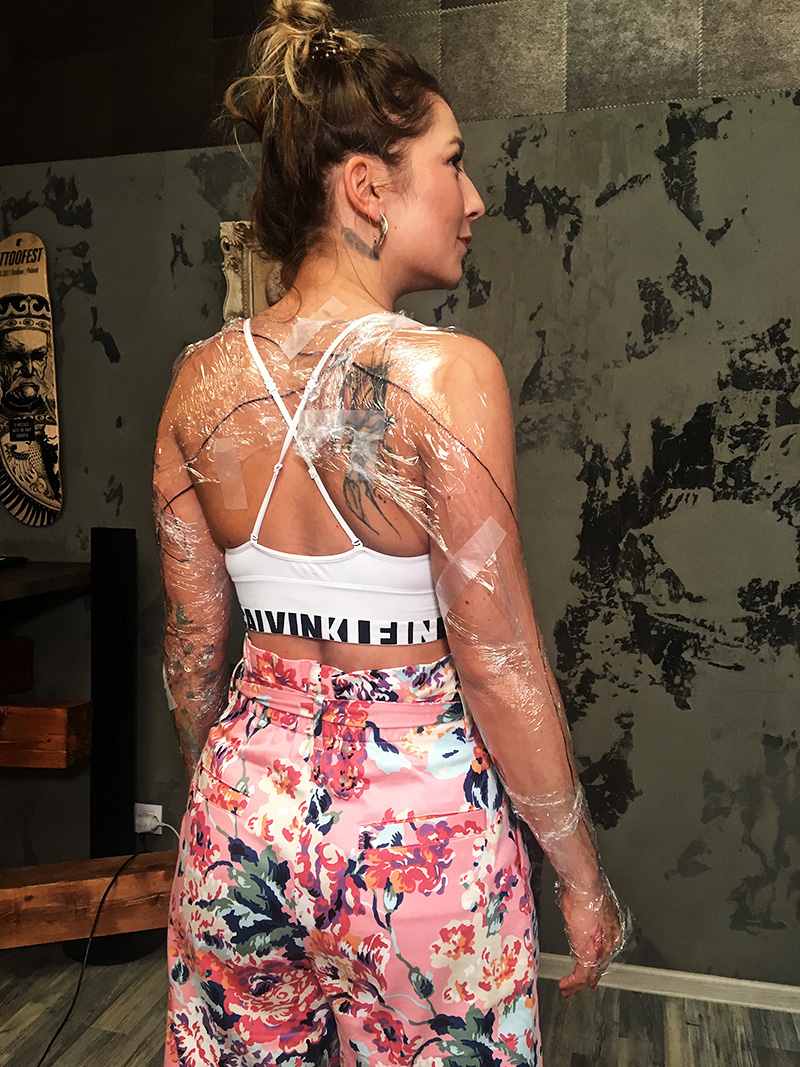 Trošku větší novinkou, než novej oblíbenej letní drink, je tetovačka. Šla jsem na dobarvení mých starších motivů, aby mi to celý barevně ladilo a den před termínem mě napadlo, že bychom jednu z těch mnoha čar mohli protáhnout až na druhou ruku. Tu rozhodně nechci mít barevnou, ale minimalistická čára se mi zdála jako fajn nápad, tak jsem to další den před Danem nadhodila. Chytil se ihned, načmáral na mě něco trošku jinýho, než jsem čekala, ale zároveň něco, s čím jsem se okamžitě sžila a o pár hodin později jsem byla celá zabalená ve fólii a s ještě širším úsměvem na rtech, než jsem čekala.