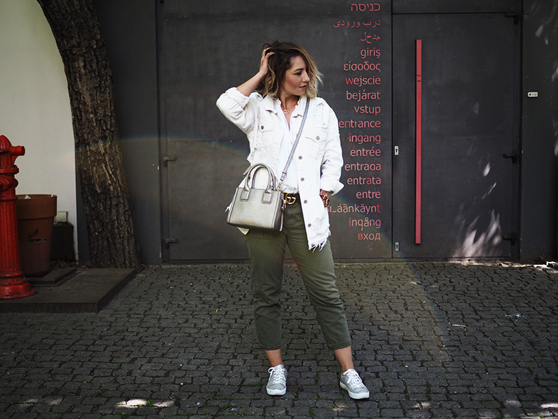 Nikdy se mi moc nelíbily ty tvoje bílé polobotky a ani velká černá kabelka s hadí perforací, ale spolu to neskutečně funguje, minimálně teda na fotce před Tretters. Modrá košile s kapsami je super, mám podobnou, vždycky si v ní připadám jak dopravák, tak vítej v klubu 😀 Co je ale naprosto boží jsou ty kytkovaný kalhoty s růžovou košilí na uzel, náádhera ***** Luca