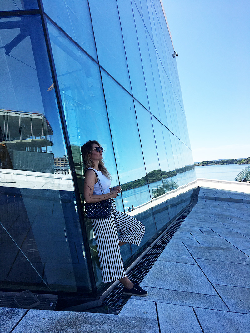 Na hotelu se nachystáme na Olympus Summer Party, která je důvodem našeho výletu, dodržíme denimový téma eventu (jako skoro jediný, z čehož jsme pozdějc trošičku rozčarovaný) a protože se zdá, že je akce kousek od našeho hotelu, vyrážíme v podpatkách pěšky. Ani se totiž neptejte, kolik stál Uber z letiště. Oslo je nádherný a my nevycházíme z úžasu. Stejně tak celá akce, kde se seznamujeme s blogerkama z Norska a z Maďarska. Všechny jsou strašně milý a příjemný, včetně organizátorů a fotografů. A tak posedáváme, popíjíme, okukujeme novej model Olympus EPL9 v modrým provedení a později se vytrácíme na procházku do přístavu.