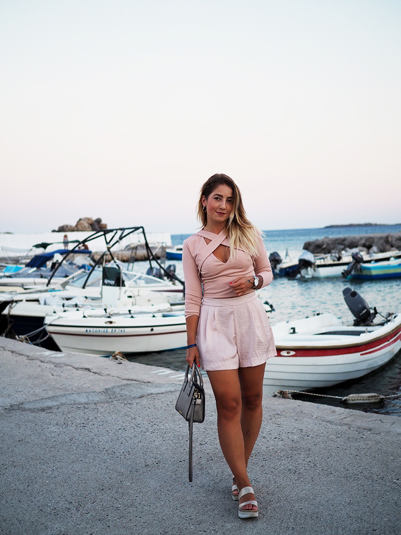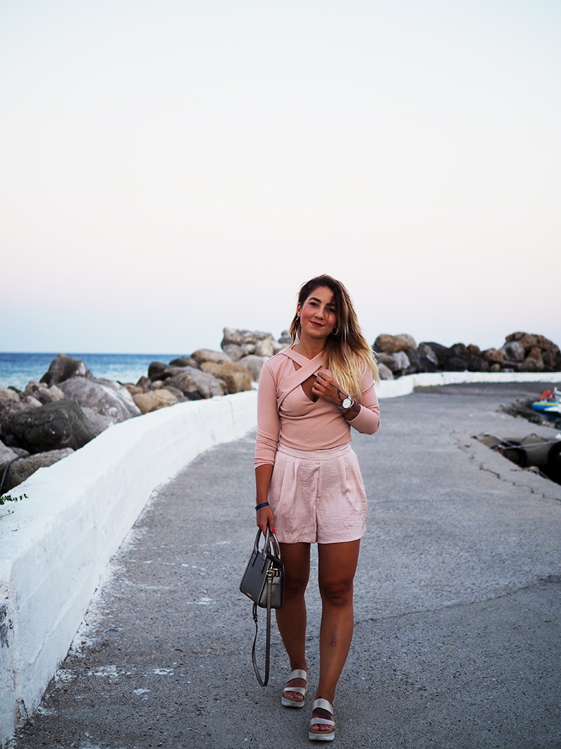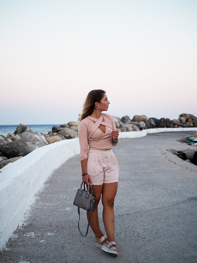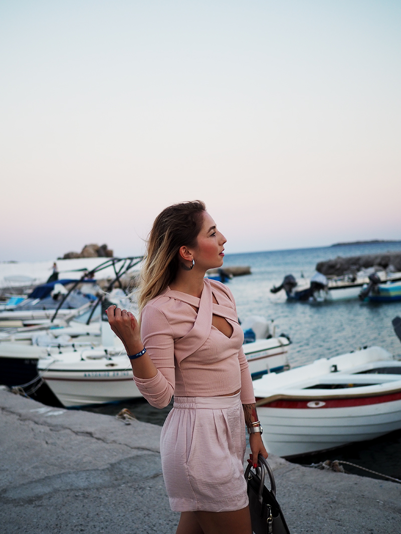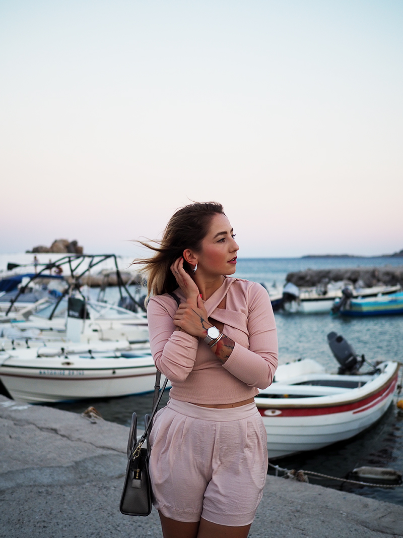 Čauky z nočního letiště na Rhodosu, náš let má nějakou tu hodinku zpoždění, takže tahle noc bude asi sakra dlouhá. Nicméně pro mě momentálně skvělá příležitost dát dohromady tyhle fotky z včerejšího focení v přístavu s nádherně narůžovělým nebem a outfitem, kterej už na Instagramu sklidil příjemné ovace. Oblečená celá v růžový běžně nechodím, ale na dovolený mám většinou všechno trošku posunutý a troufnu si na jiný věci. Třeba na krátký kraťasy a třeba na celorůžovej outfit. Doplňky jsem zvolila zlatý – sandálky na platformě, Karl mini kabelku a pár šperků na dotažení. Všimněte si (ne že by si toho šlo nevšimnout :D) hlavně toho božího nebe, který mi bude hodně, hodně, hodně chybět, protože v Praze teda takový nemáme.