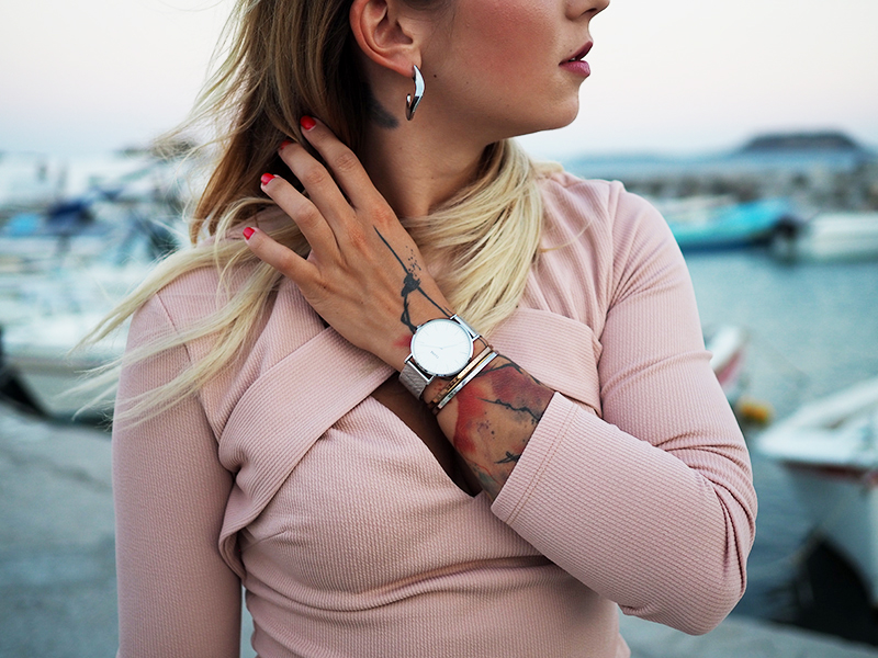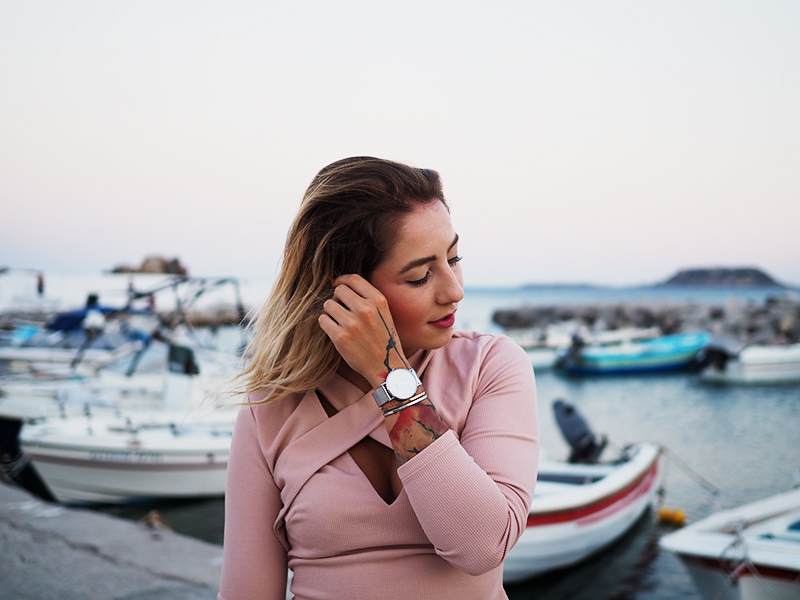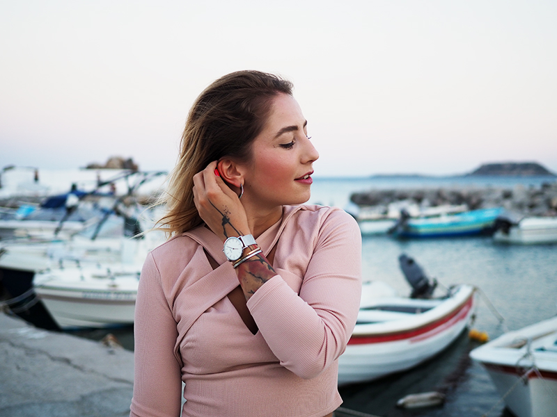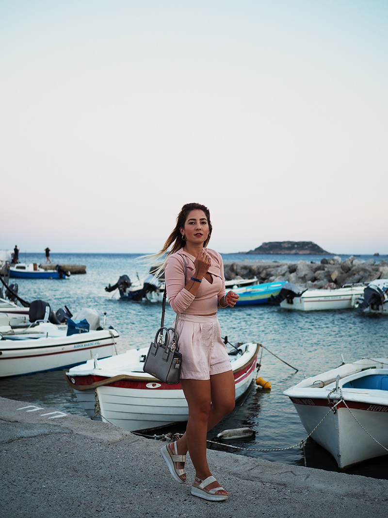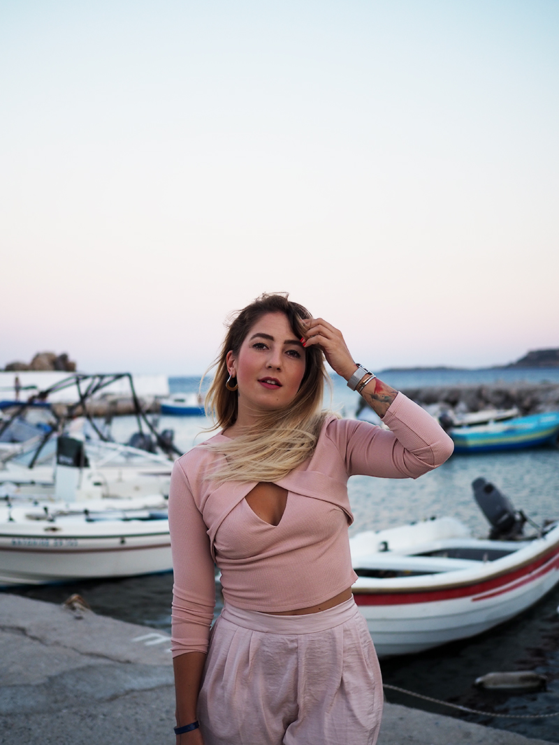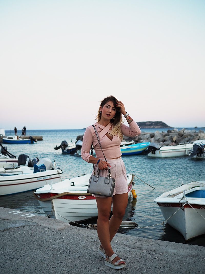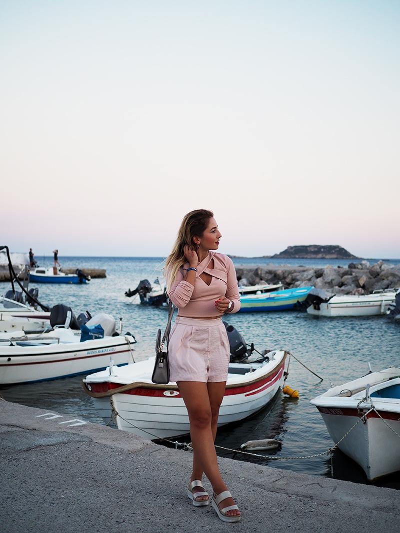 Čauky z nočního letiště na Rhodosu, náš let má nějakou tu hodinku zpoždění, takže tahle noc bude asi sakra dlouhá. Nicméně pro mě momentálně skvělá příležitost dát dohromady tyhle fotky z včerejšího focení v přístavu s nádherně narůžovělým nebem a outfitem, kterej už na Instagramu sklidil příjemné ovace. Oblečená celá v růžový běžně nechodím, ale na dovolený mám většinou všechno trošku posunutý a troufnu si na jiný věci. Třeba na krátký kraťasy a třeba na celorůžovej outfit. Doplňky jsem zvolila zlatý – sandálky na platformě, Karl mini kabelku a pár šperků na dotažení. Všimněte si (ne že by si toho šlo nevšimnout :D) hlavně toho božího nebe, který mi bude hodně, hodně, hodně chybět, protože v Praze teda takový nemáme.