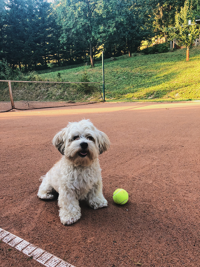 Společně jsme taky vyrazili na chalupu, kde Toby pravidelně asistuje při tenisu a já nechápu, že to vždycky všichni ve zdraví přežijem. Představte si, že se snažíte vybrat údery a tenhle malej trouba jde po stejným míčku jako vy.