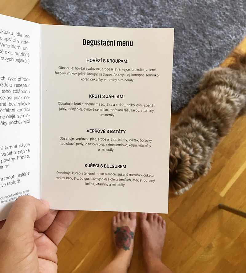 Na další fotce se můžete podívat, co degustační menu obsahujete a určitě mrkněte na web: Hundebar – první pořádné jídlo pro pejsky. Moji kluci to schválili okamžitě. ✔