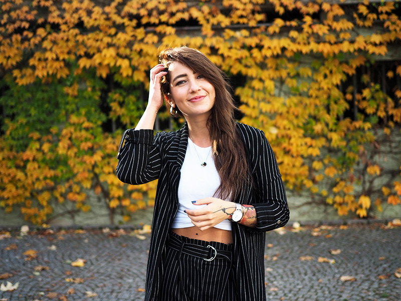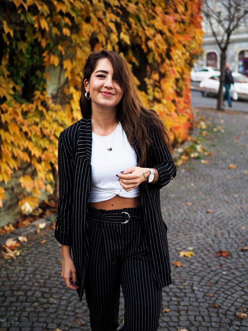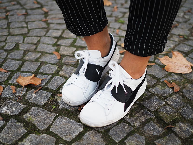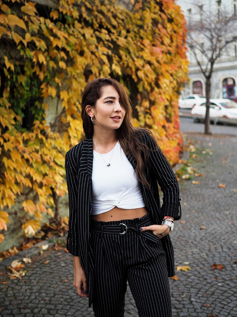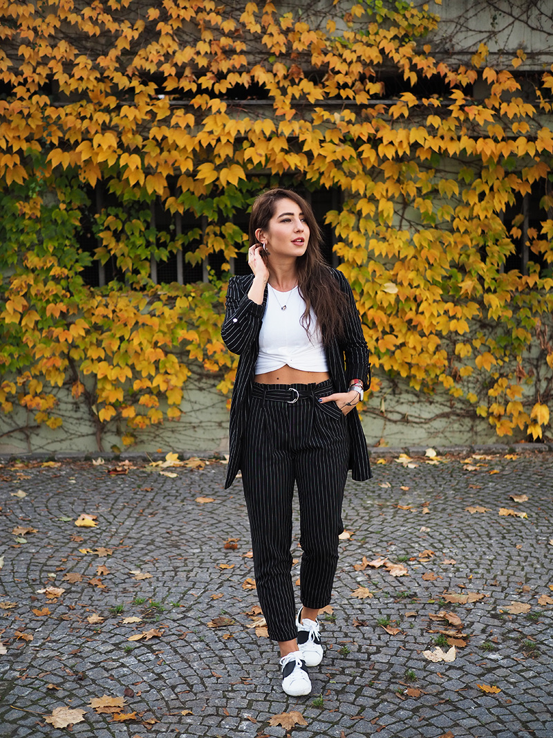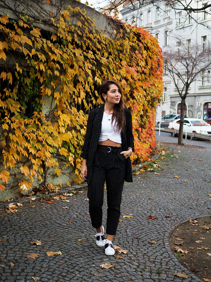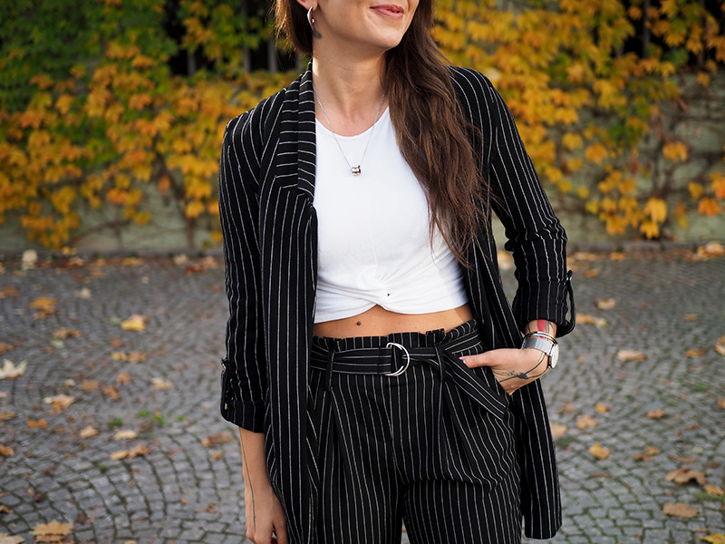Sako, top – STRADIVARIUS / kalhoty – ANSWEAR / boty – PUMA X KARL LAGERFELD / šperky – CALVIN KLEIN