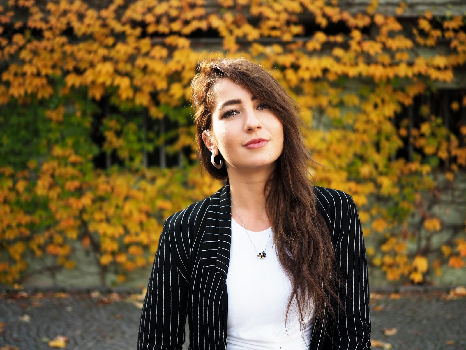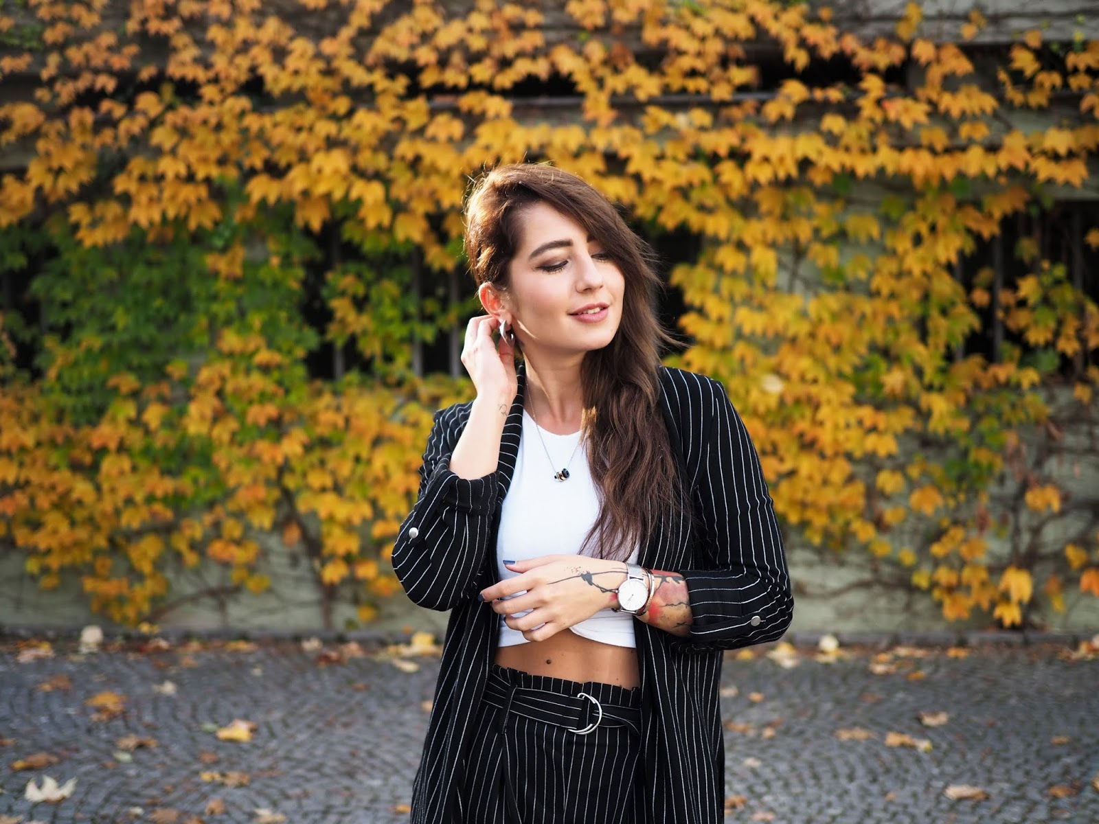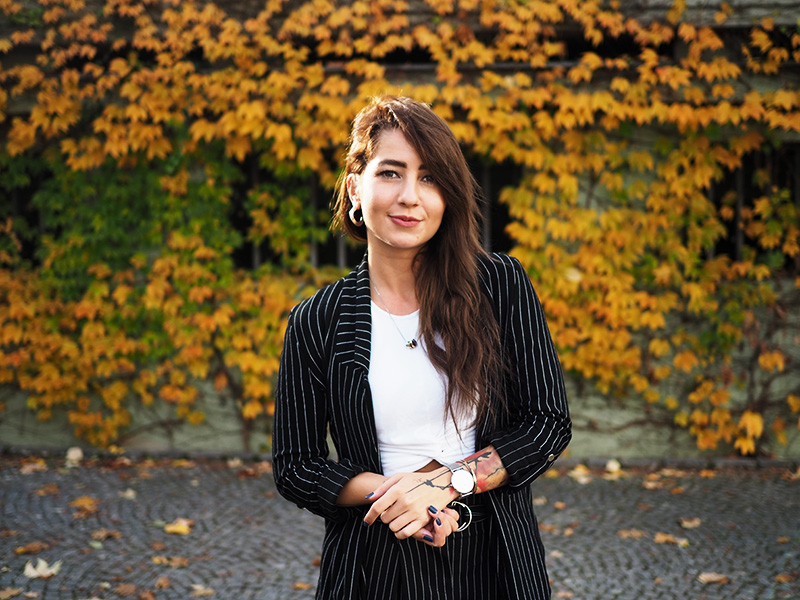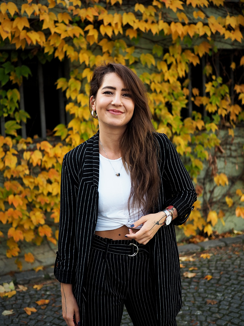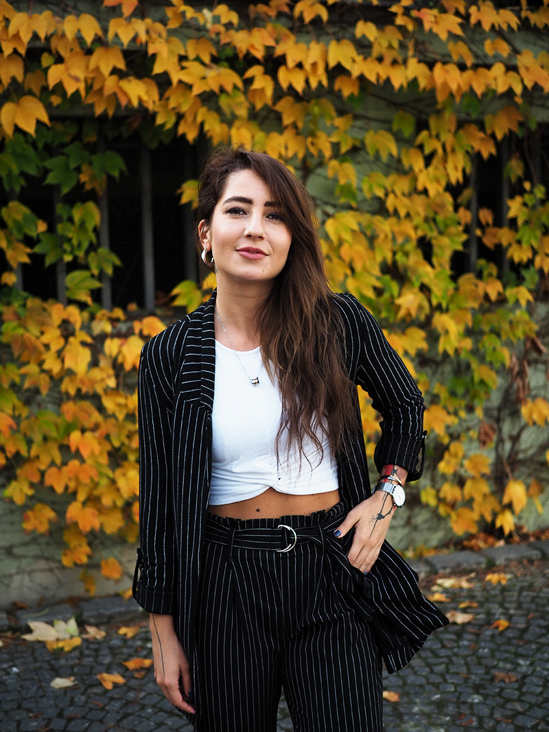 Sako, top – STRADIVARIUS / kalhoty – ANSWEAR / boty – PUMA X KARL LAGERFELD / šperky – CALVIN KLEIN
