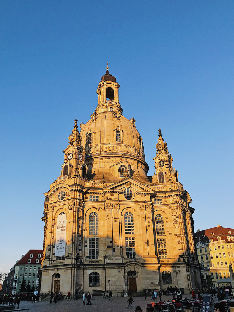 Kostel, stojící uprostřed náměstí, je jednou z nejvýznamnějších barokních staveb v Nemecku, nabízí možnost vyhlídky na celé město a jeho kopule patří k nejvyšším na sever od Alp. Stejně jako Zwinger, i kostel byl v důsledku náletů, bombardování a rozsáhlého požáru zničen. Nebyl přímo zasažen, ale pískovec neustál vysoké teploty způsobené požárem (až 1200 °C) a den po požáru se zhroutil. Všimněte si ale tmavých kamenů – jsou totiž původní. Ty kameny, které vydržely, se v rámci rekonstrukce zakomponovaly do četných modelů, ze kterých bylo zjištěno jejich původní umístění a do zrekonstruované stavby se díky tomu podařilo zakomponovat 43% původních součástí.
