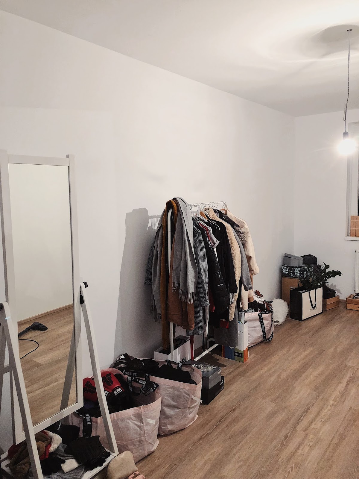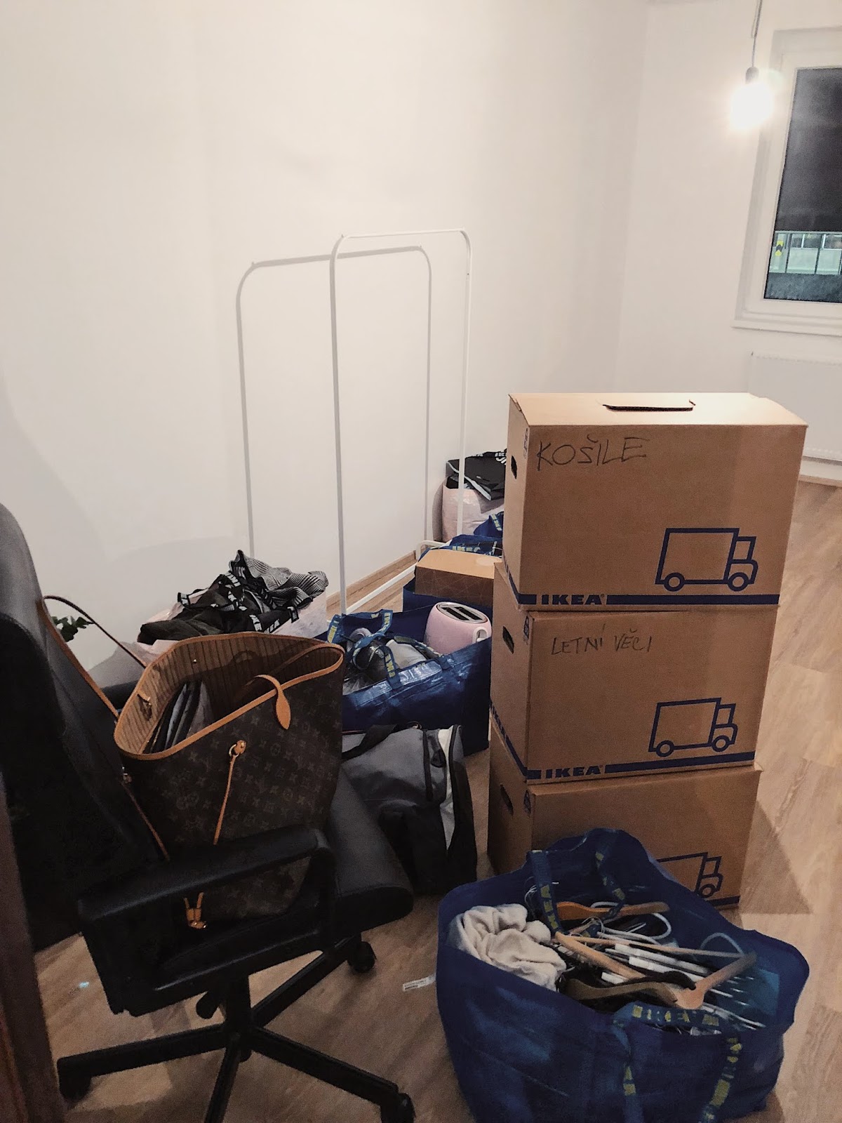 Takhle nějak vypadala moje “zabydlená ložnice” a popravdě, není to teď o moc lepší. Sice už mám většinu nábytku, ale ne skříň a tak mám stále všechny věci v Ikea taškách a krabicích. A ne, fakt mě to nebaví. Ale zjišťuju, že řešit vestavěný skříně je skoro stejnej porod jako ta šílená kuchyň.