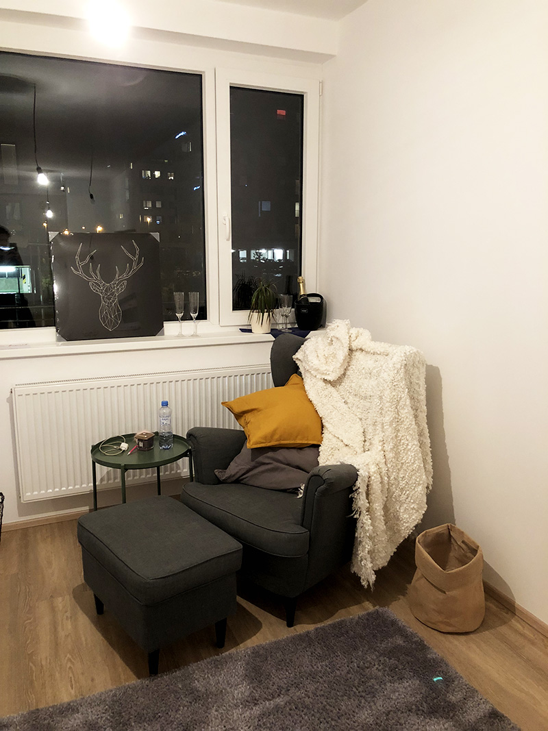 V jednom rohu jsem si udělala svůj dočasnej koutek, kterej časem zruším a bude místo něj regulérní obývák s velkým gaučem na válení, světlým kobercem, televizí a stolečkama. Těšim těšim!
