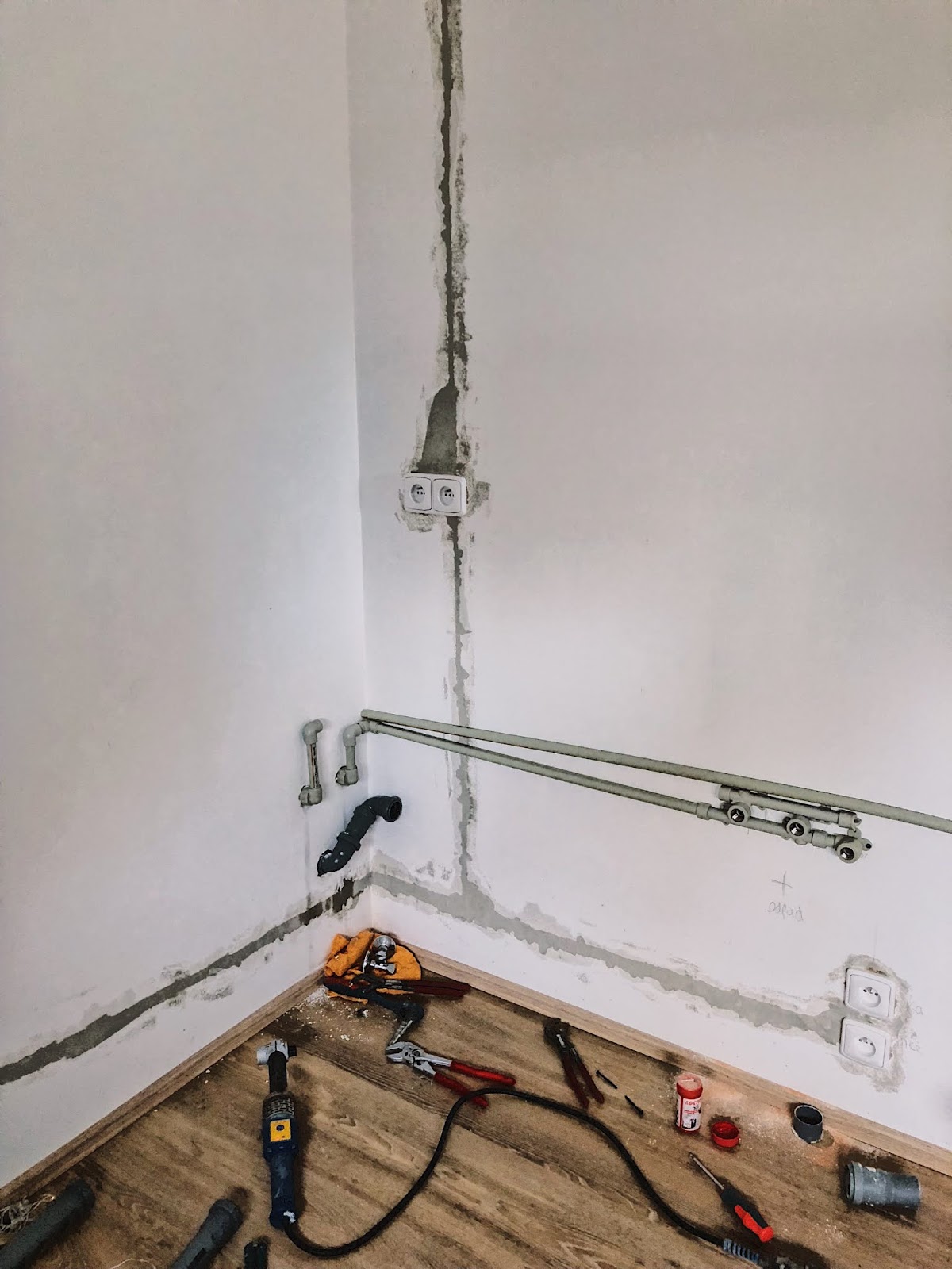 Byt jsem teda převzala, s elektrikářem jsme to tam ihned rozkopali, takže ten byt byl čistej a můj asi tak dvacet minut. Rozvody se dělaly podle toho, jak je nakreslil člověk, co byl kuchyň předem zaměřovat a jak je tam on sám rozvrhl a nakreslil na zeď. To, že to nakreslil špatně a že se to bude muset předělat jsem samozřejmě zjistila až ve chvíli, kdy už byla kuchyň namontovaná. Já bych si tak ráda dělala VŠECHNO sama, abych to měla pod kontrolou. Achjo. 😀