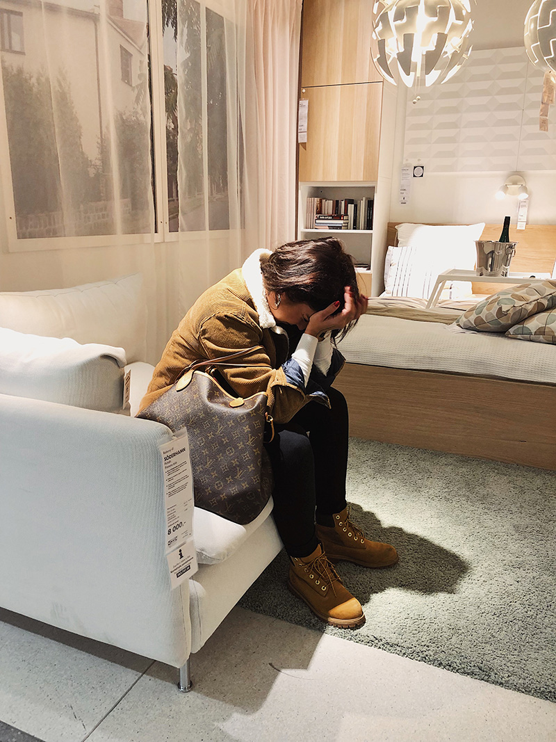 Opravdovej problém nastal, když došlo na další vybavování. Vybrat si sedačku, která by se mi líbila a zároveň nestála několik desítek tisíc byl pro mě nadlidskej úkol, takže jsem ho po pár týdnech vzdala a odložila na neurčito, pár sedaček jsem si vyhlídla online a třeba na nějakou začnu i šetřit. Kdo ví, obývák holt teď není priorita.