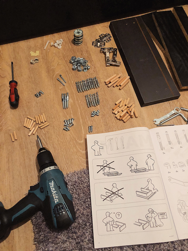 Doma totiž bylo pořád co stavět. První velikou výzvou pro mě byla komoda se šesti šuplíkama, protože moje minulá zkušenost mi říkala, že šuplíky nejsem schopná udělat tak, aby byly rovně a fungovaly. Brácha se k tomu ale uprostřed zkouškovýho neměl a já už si fakt nutně chtěla někam dávat oblečení a tak jsem se do toho plná odhodlání pustila. A ono to šlo! A stejně jako u veškerýho mýho montování, i tady nastal jeden jedinej moment, kdy jsem si nevěděla rady a rozčilovala se nad tím. Většinou ale stačilo dát si chvíli pauzu a pořádně prozkoumat návod nebo prostě někoho požádat o online nebo offline pomoc.