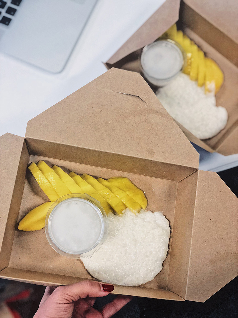 S Ivčou jsme musely smutně vyhodnotit, že mango sticky rice tady prostě neseženem. Nebo jo, ale s tím thajským to moc společnýho nemá. Na druhou stranu musím říct, že Lemon Leaf by si možná trošku toho ocenění zasloužil.