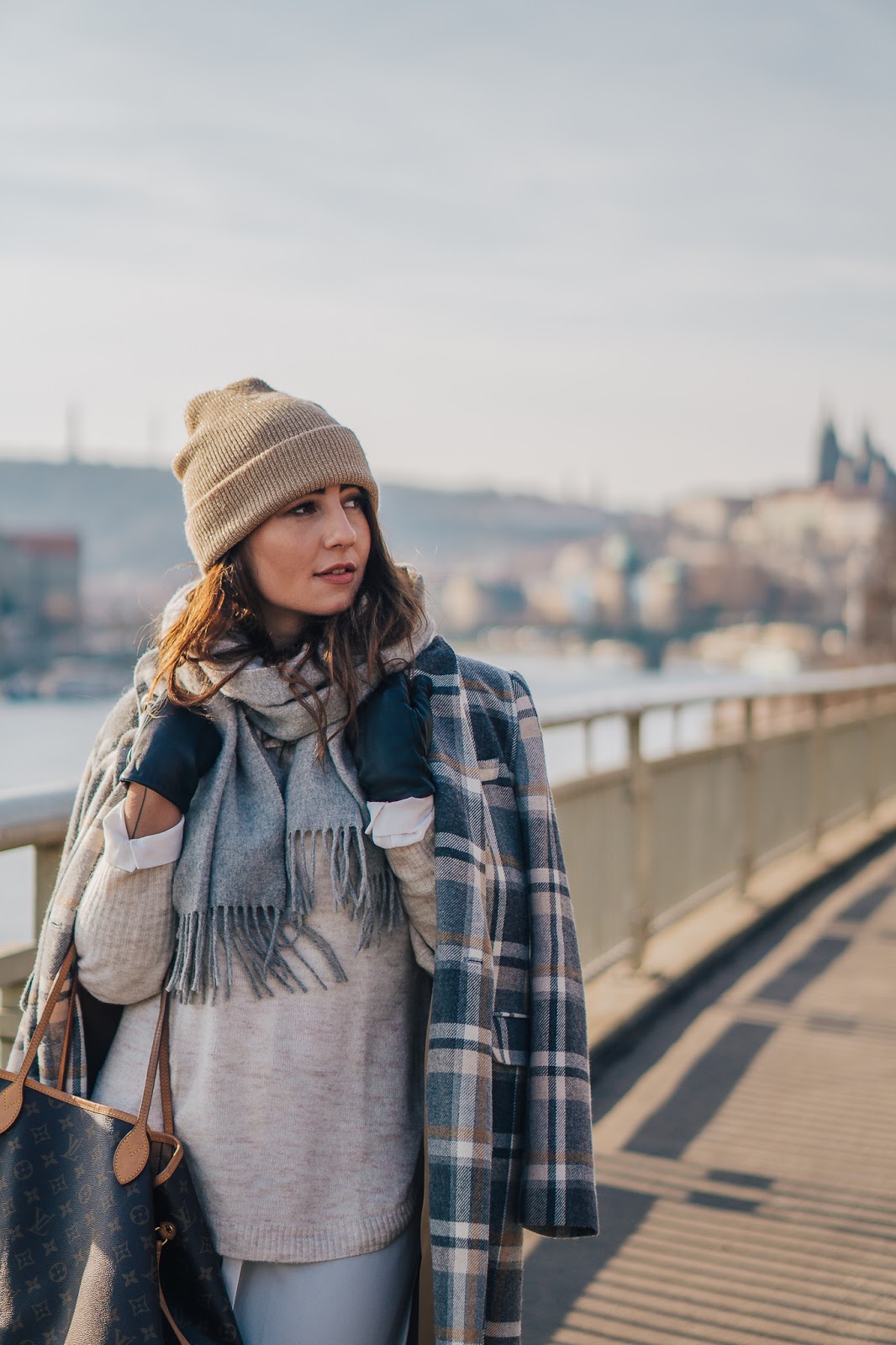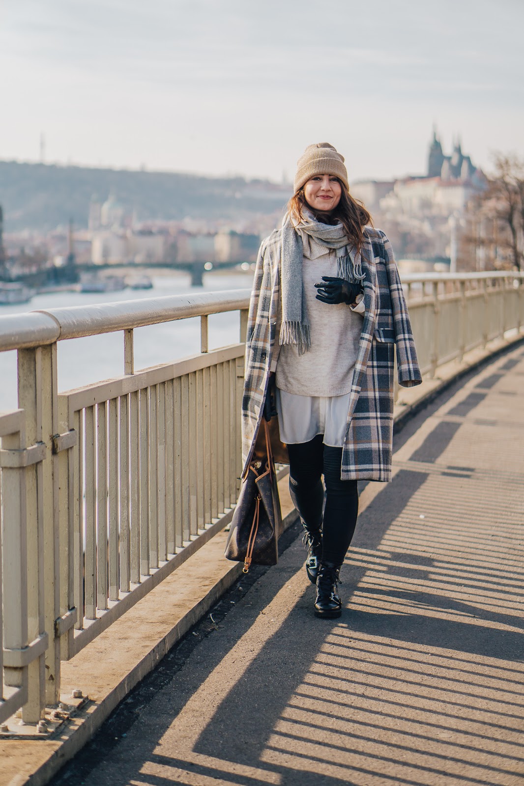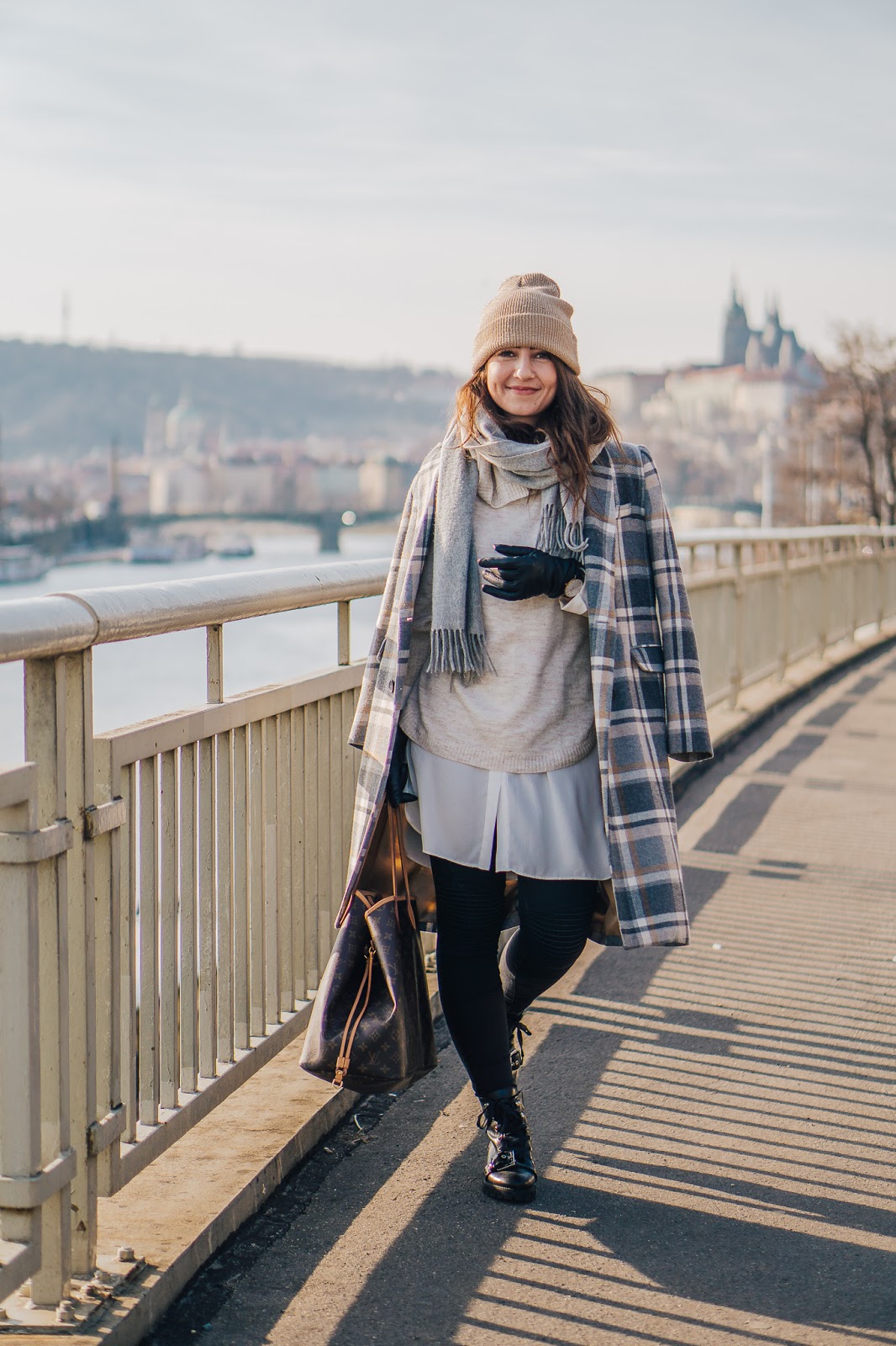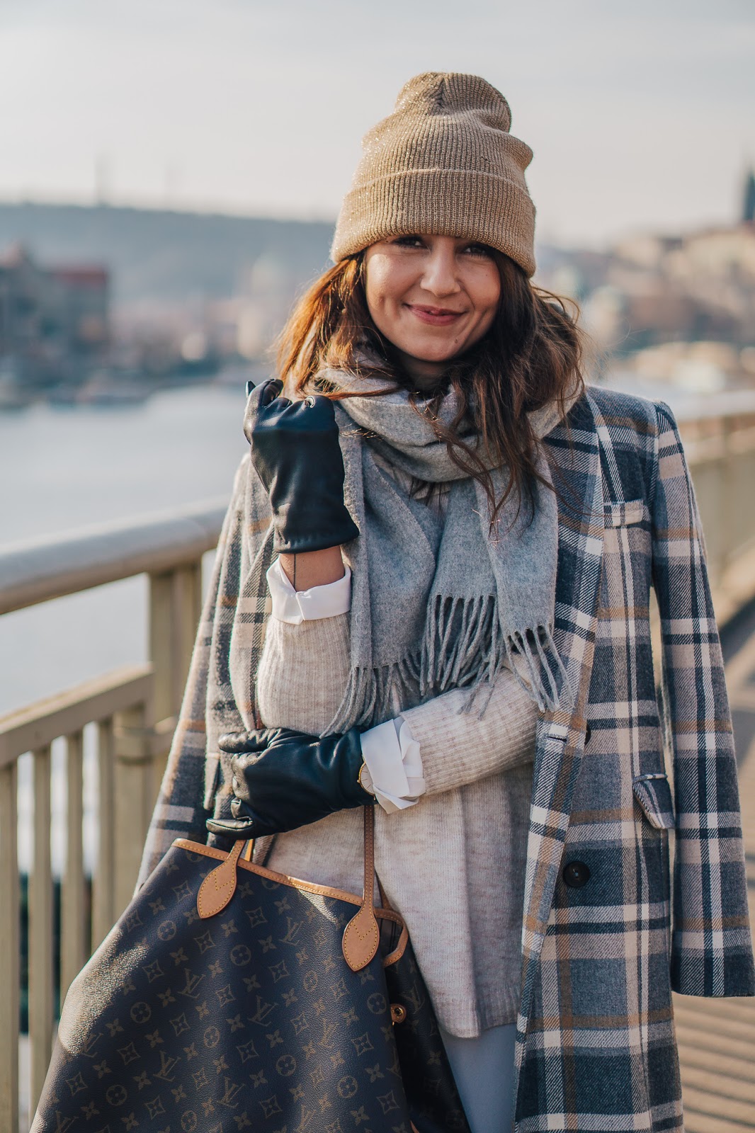 Kabát – STRADIVARIUS / svetr – GAP / košile – LINDEX / kalhoty – JENNYFER/ šála – GANT / čepice, rukavice – ZARA / kabelka – LOUIS VUITTON / boty – STEVE MADDEN