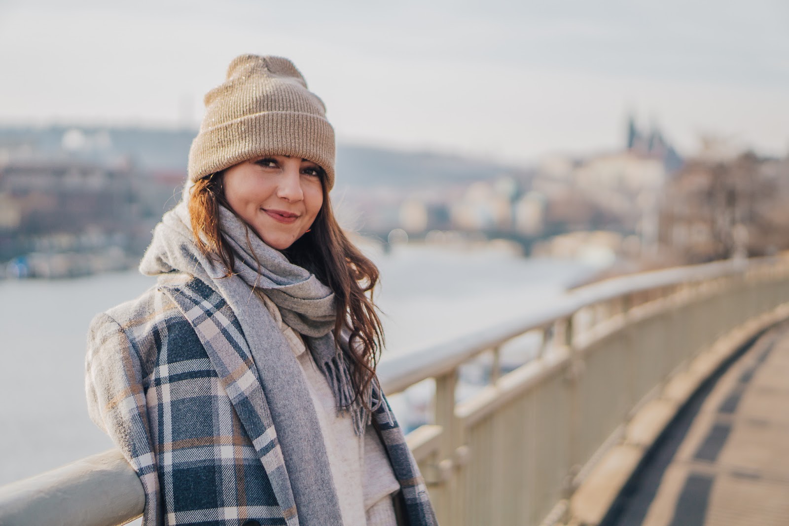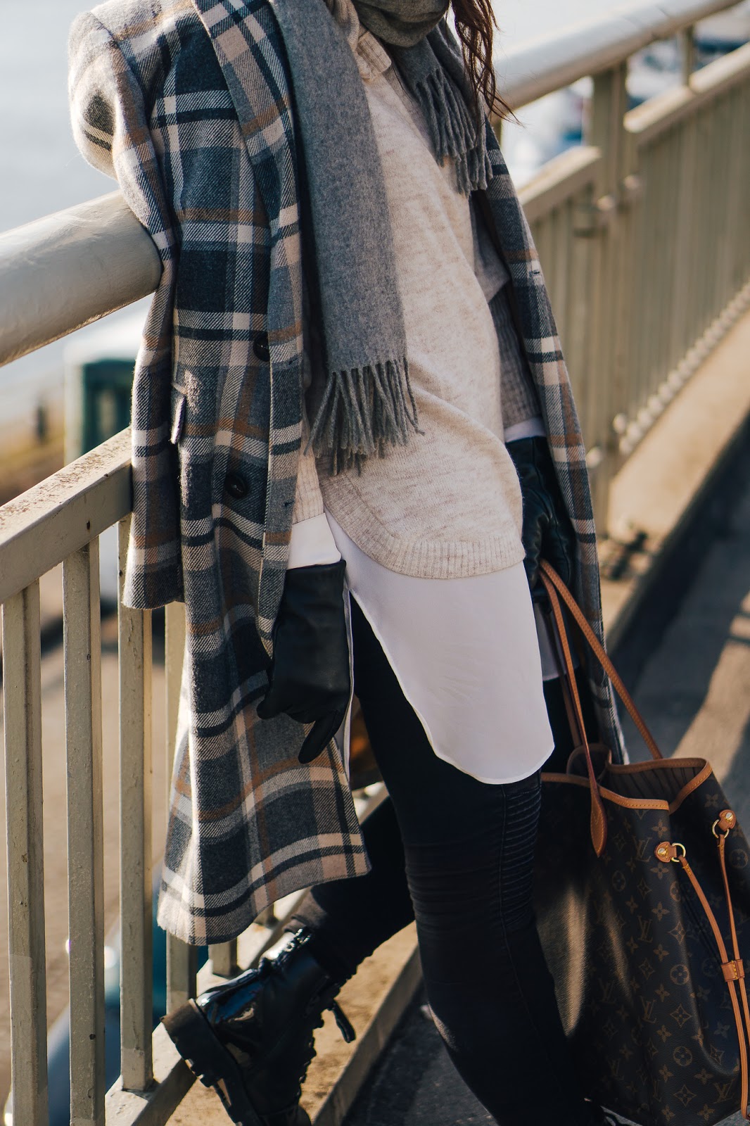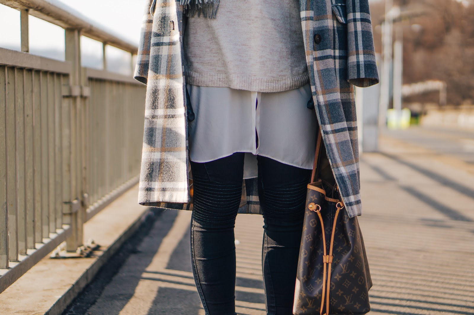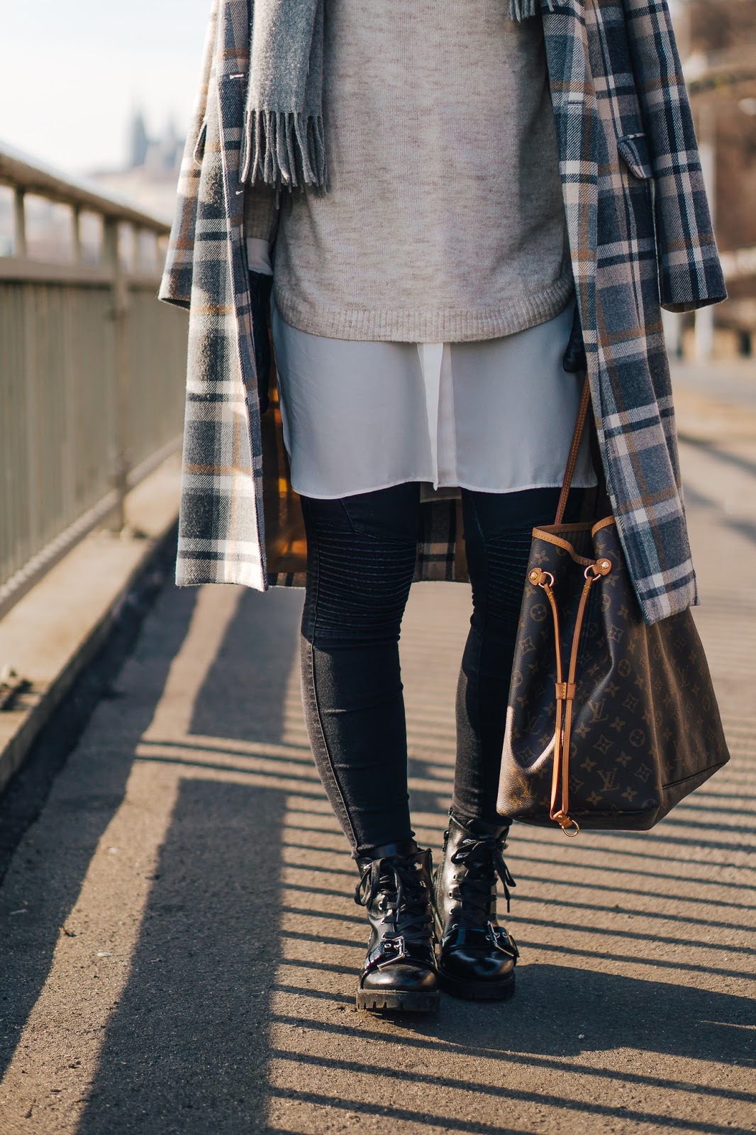 Kabát – STRADIVARIUS / svetr – GAP / košile – LINDEX / kalhoty – JENNYFER/ šála – GANT / čepice, rukavice – ZARA / kabelka – LOUIS VUITTON / boty – STEVE MADDEN
