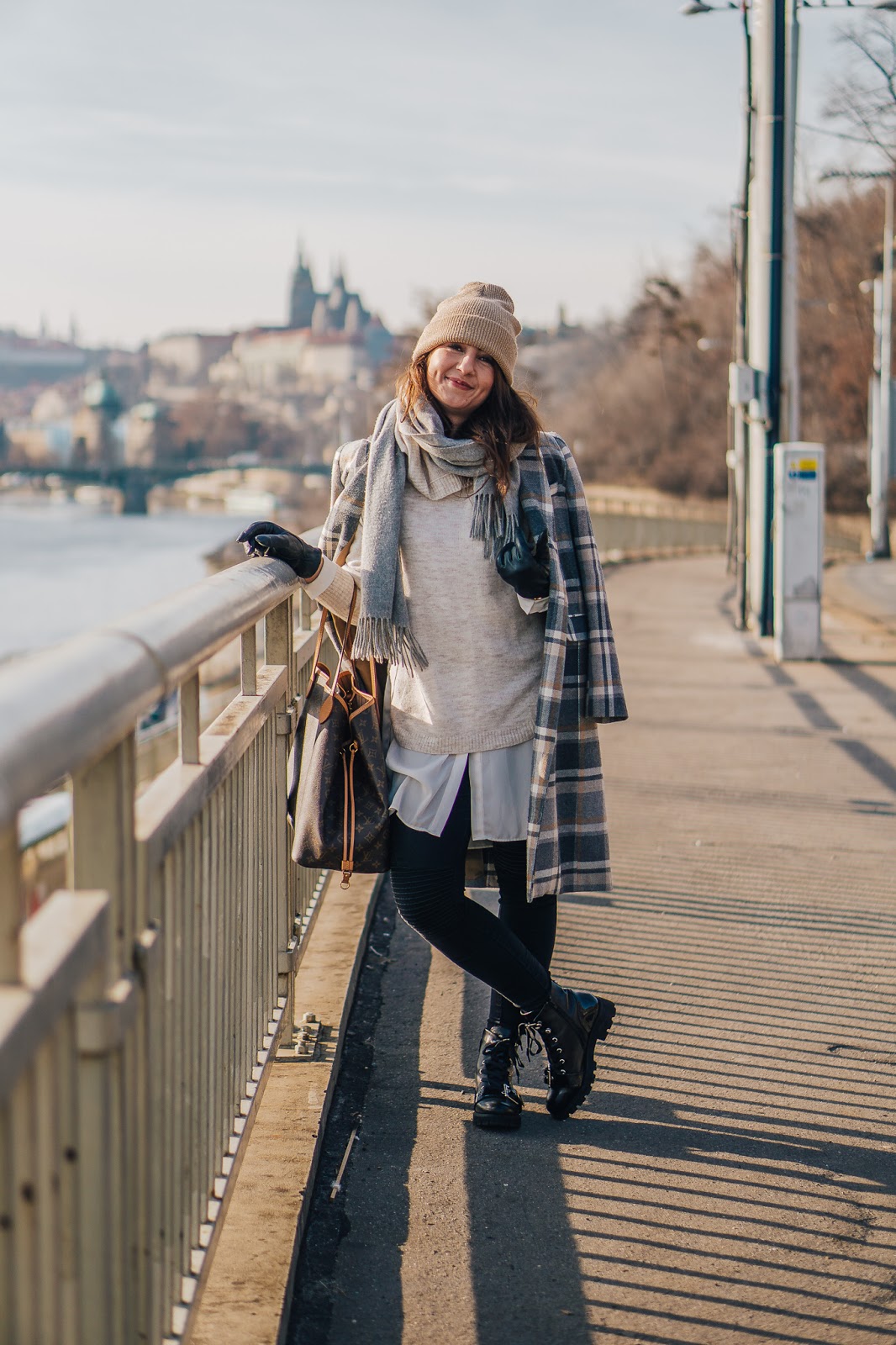Ráda bych řekla, že jsem tenhle outfit měla na sobě dnes, kdy je venku konečně hezky a úměrně k tomu, aby si člověk mohl dovolit nosit rozepnutej kabát aniž by umrzl. No… Každej rok si dávám předsevzetí, že si na zimu konečně pořídím opravdu teplou bundu. Bundu, která bude kromě tý “teplosti” i hezká, dobře kombinovatelná a budu ji ráda nosit. Za poslední 4 roky se mi to nepovedlo dodržet a najít tu, co by splňovala moje požadavky. Naštěstí už to vypadá (ťuk ťuk), že se schyluje na lepší časy a přichází jaro, takže to můžu opět odložit na další rok, nasdílet vám tento outfit pro inspiraci, protože je teď i nositelnej a taky si začít konečně opravdu užívat těch svých několik “zimních” kabátů, co maj jen jeden knoflík. Jedním z nich je právě tento z fotek, kterej jsem pořídila ve slevách ve Stradivariu za pár korun a dělá podle mě dost velkou parádu. Pohrála jsem si k němu s vrstvením dalších kousků v barvách kabátu, aby mi to celý ladilo a zároveň to bylo díky vrstvení zajímavější. Dlouhých bílých košil není nikdy dost – evidentně, protože se mě na ně ptáte nejčastěji – a já mám svý oblíbený dvě, jednu z Lindexu, kterou mám už asi 5 let a začíná se rozpadat a druhou z Manga. Koukám teď po nějaký další, tak jakmile seženu, ráda se podělím o tip, zatím je to ale marný. Přes dlouhou košili jsem přehodila měkkoučkej svetr z GAPu, doplnila šálou a čepicí, kalhotama s “motorkářskýma” (říká se tomu tak?) kolenama, který mám taky přes 5 let (a taky se rozpadaj) a novýma Steve Madden botama, který jsou mým nejlepším zimním kupem (TADY jsou teď navíc ve slevě).