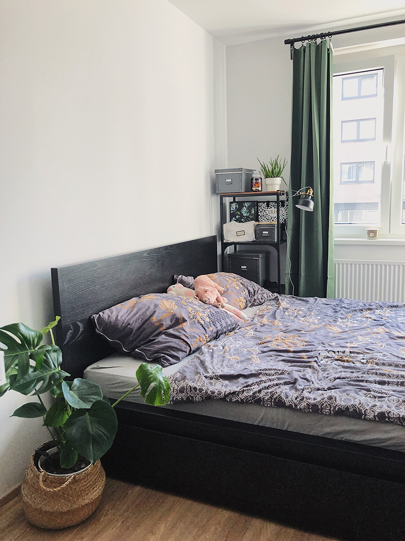 Jeden z pohledů, kterej už vypadá téměř hotově – chybí jen police nad postelí – a můžu vám tak konečně ukázat hezkej výsledek části všech těch zabydlovacích peripetií. Miluju tu kombinaci přírodních barev. Povšimněte si taky plyšáků v posteli s řekněte mi, v jakým věku to člověka přejde. 😀