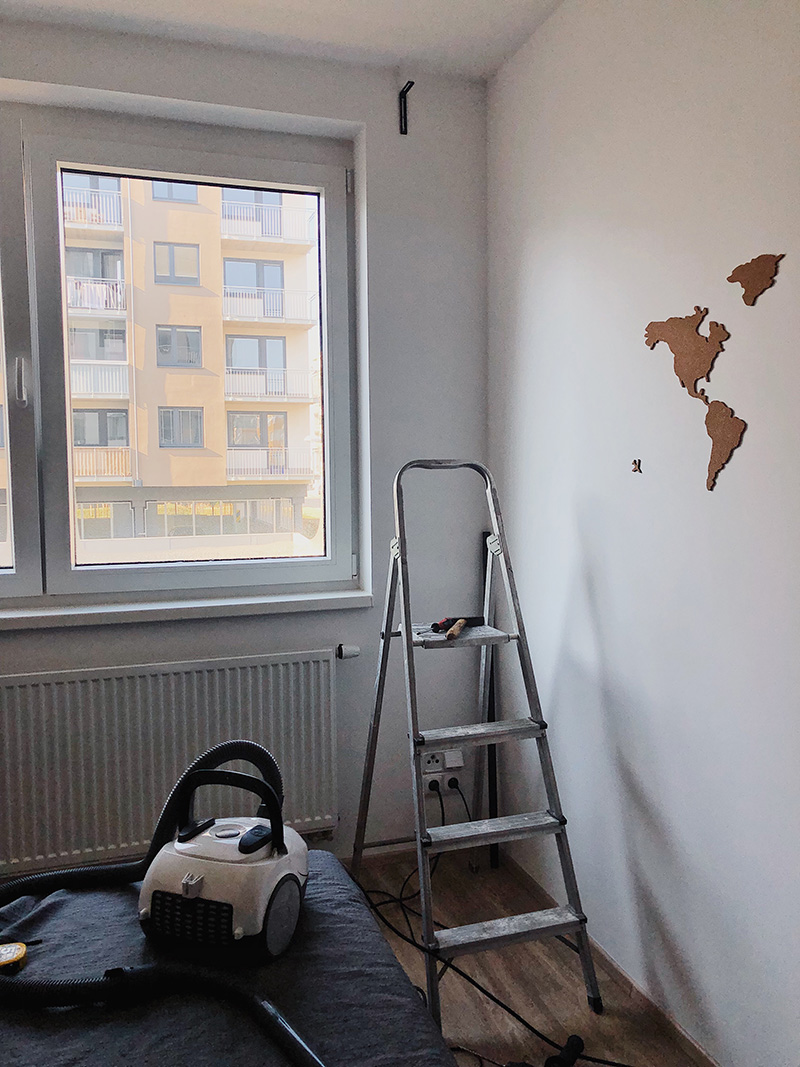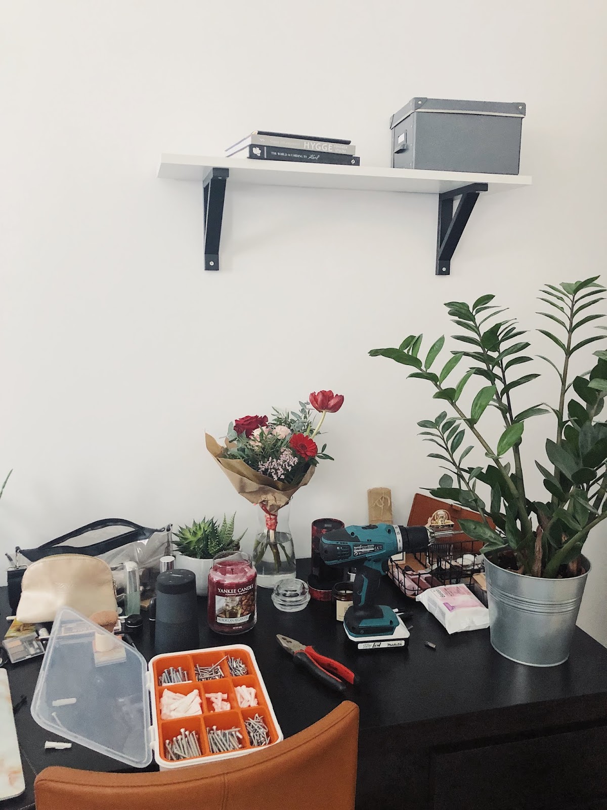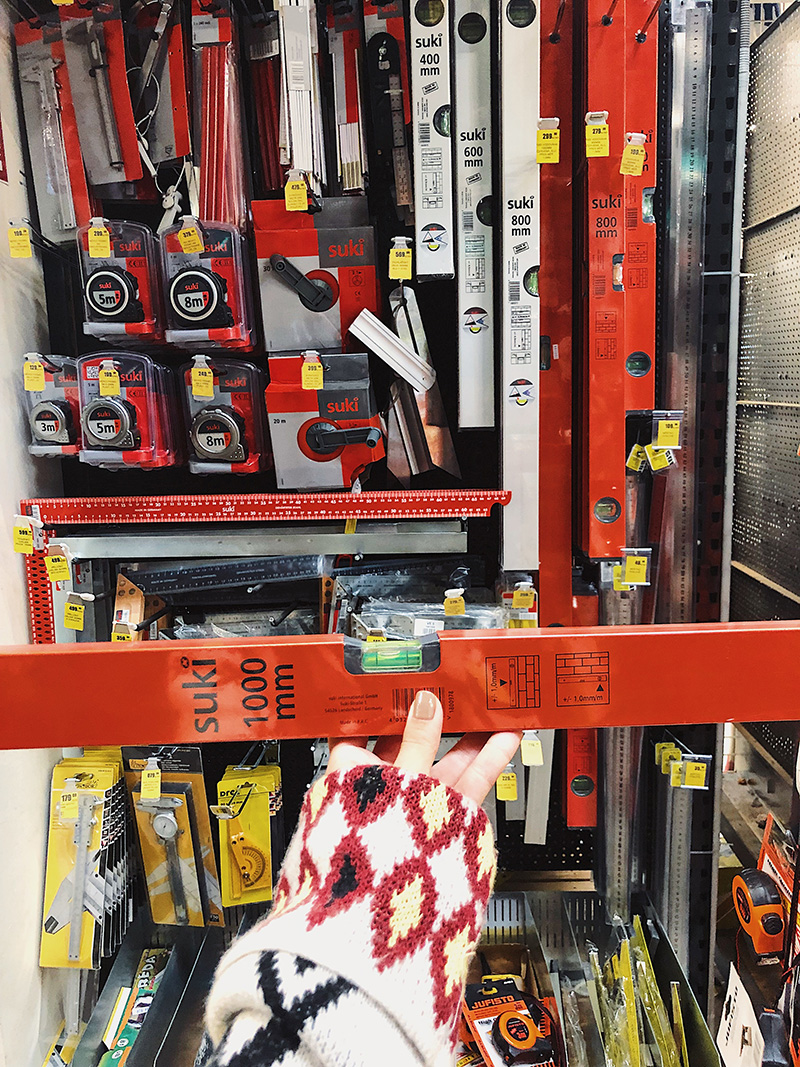 A protože už jsem měla všechno smontovaný, nastal čas na navrtání poliček do skříně a aby to bylo rovně, byla potřeba vodováha. Takže se jelo do Bauhasu. A pak bylo v plánu to konečně dotáhnout, namontovat závěsy, poličky nad stůl a poličku k posteli.