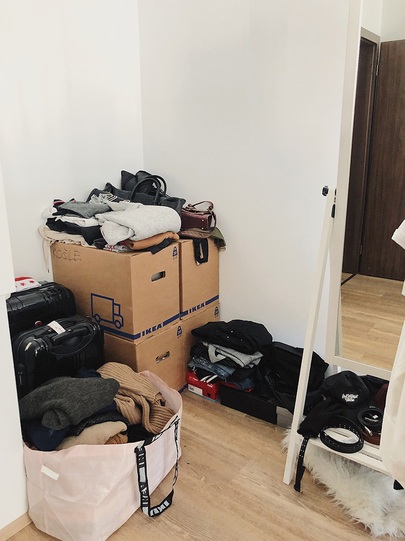 Co ještě před pár dny na svůj moment čekalo, byl šatní kout. Pár měsíců jsem totiž žila takhle a už jsem z toho byla fakt unavená. Teď už mám konečně hotovou vestavěnou skříň, ale o tom, jak jsem si ji objednávala a jak jsem pak vybalila všechno svý oblečení a zkusila úklid stylem Marie Kondo, vám řeknu spíš v dalším díle.