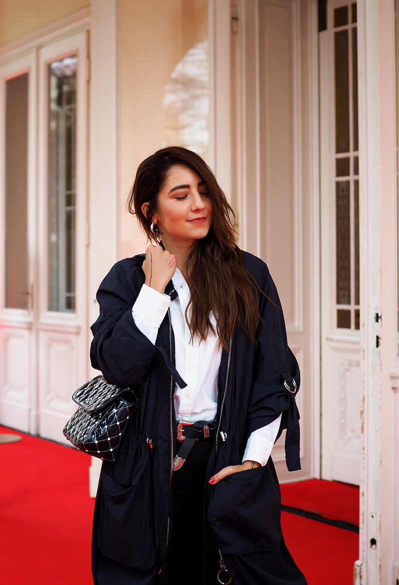 V tomto outfitu jsem vyrazila na Baťa Fashion Weekend a kromě bot jsem poprvé vytáhla i bundu z Lindexu a Gantí košili. Když jsme se s Kubou po cestě stavovali pro kafe (protože jetlag hitting hard), nahlas jsem si řekla, že se HLAVNĚ NESMIM POLEJT. Jenomže kafe a bílá košile je něco jako magnet a neříkejte mi, že to vnímáte jinak. Bylo po dešti a mně se ty boty šíleně smekaly. Šli jsme teda šnečím tempem a u Národního divadla v tom kopečku dolů mě Kuba chytil, abych sebou náhodou nešvihla… Vteřinu potom, co mě chytil, se ale smekla noha jemu a moje kafe mi vyrazil z ruky. 😀 Říkám, kafe a bílá košile je jak magnet, ať se snažíte, jak se snažíte. Ale co, na fotku se dá dobře nastavit a na přehlídku si není potřeba sundávat bundu, takže to jde jakž takž uhrát. Toť moje kávovo-outfitový trable.