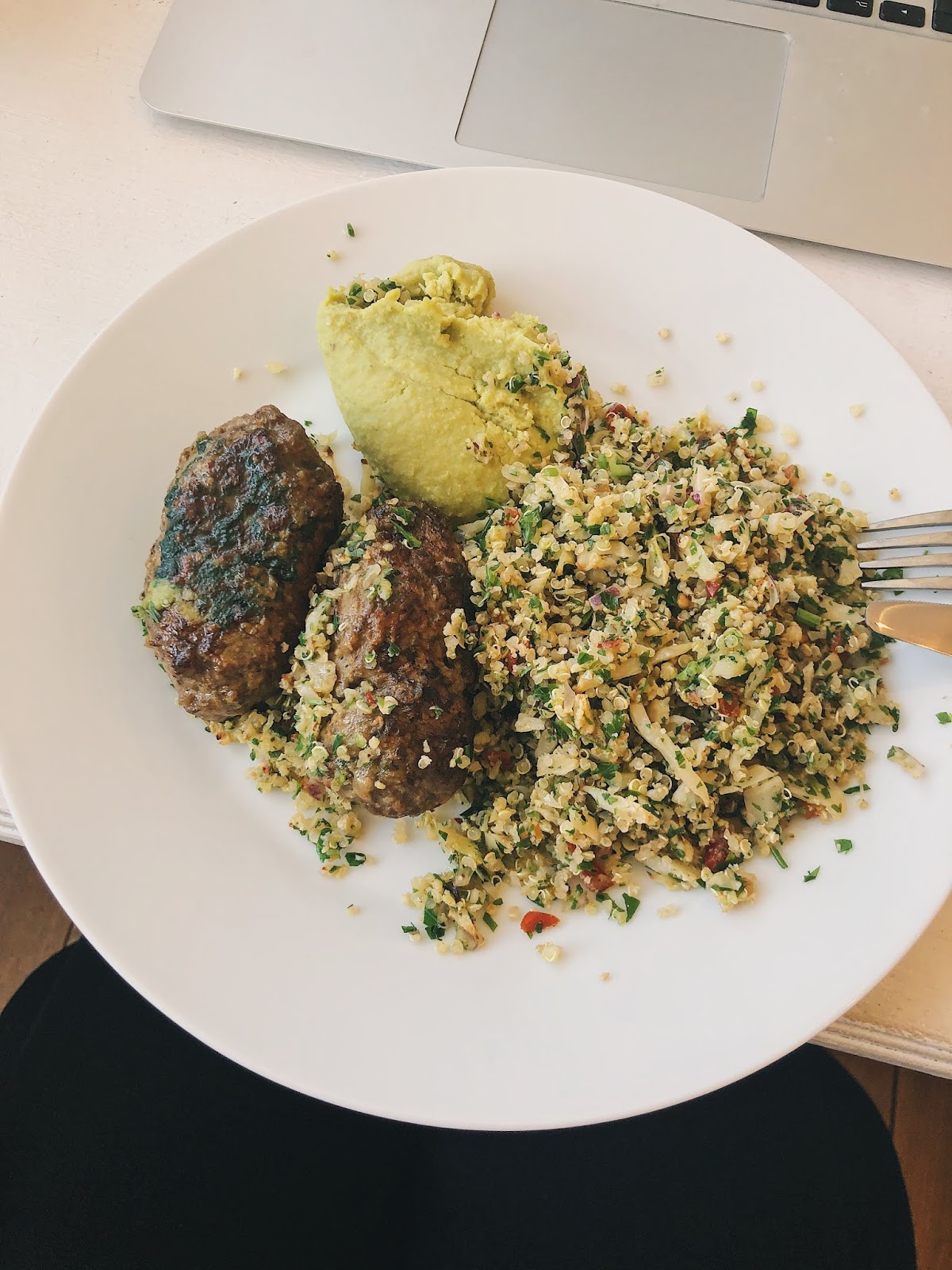 Mleté maso s quinoovým salátem, zeleninou a hummusem. |