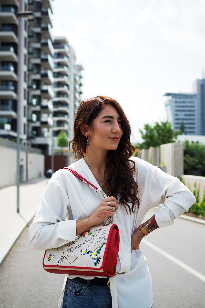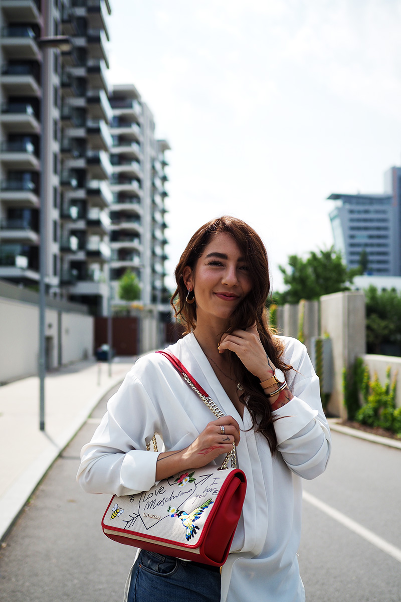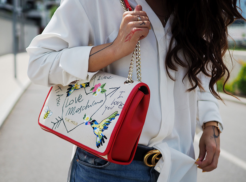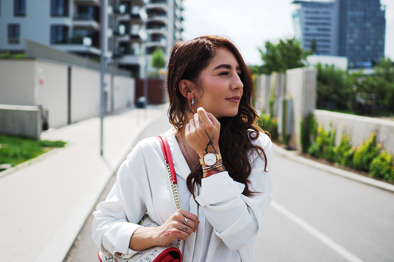 Kalhoty – H&M / košile – LINDEX / kabelka – LOVE MOSCHINO via ANSWEAR / pásek – GUCCI / boty – CCC / náušnice – CALVIN KLEIN / hodinky, náramky, prstýnky – DANIEL WELLINGTON