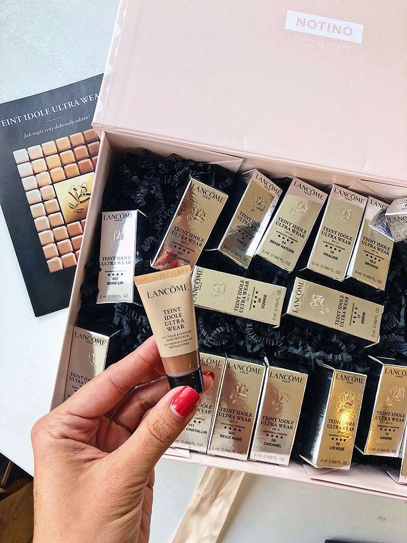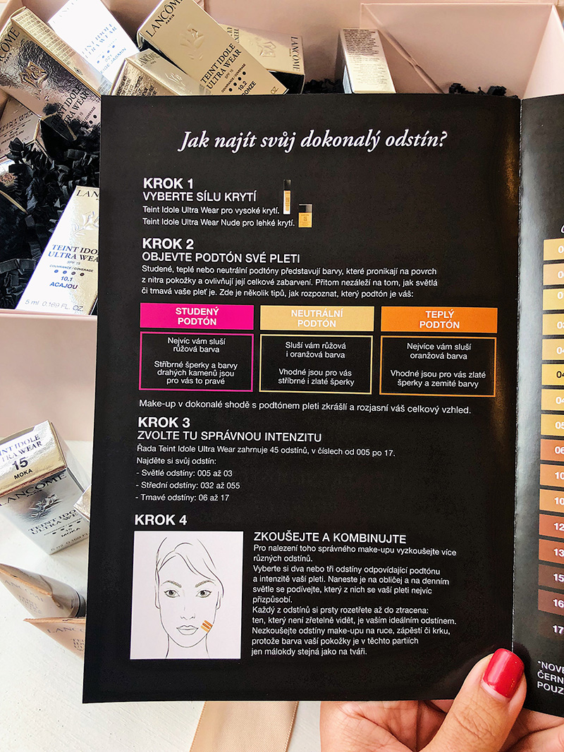 Kromě toho, že jde o dlouhotrvající vysoce krycí matující make-up, který je ideální pro všechny typy pleti a mastný vyhovuje opravdu maximálně, má taky snad největší odstínový spektrum, jaký můžete mezi make-upy najít. Já sama jsem už dávno zjistila, že není nejchytřejší nápad naběhnout do parfumerie, vyzkoušet dva odstíny a ten, co bude vypadat ok prostě vzít a pak ho doma kdyžtak míchat s jinýma, co zrovna mám. Notino mi na jaře poslalo spoustu vzorečků i s návodem, jak postupovat při výběru, tak přikládám níž, ať se můžete poučit taky. I když teda doufám, že už tady v ndešní době není nikdo, kdo by ještě odstín zkoušel na zápěstí nebo na krku! 🙂