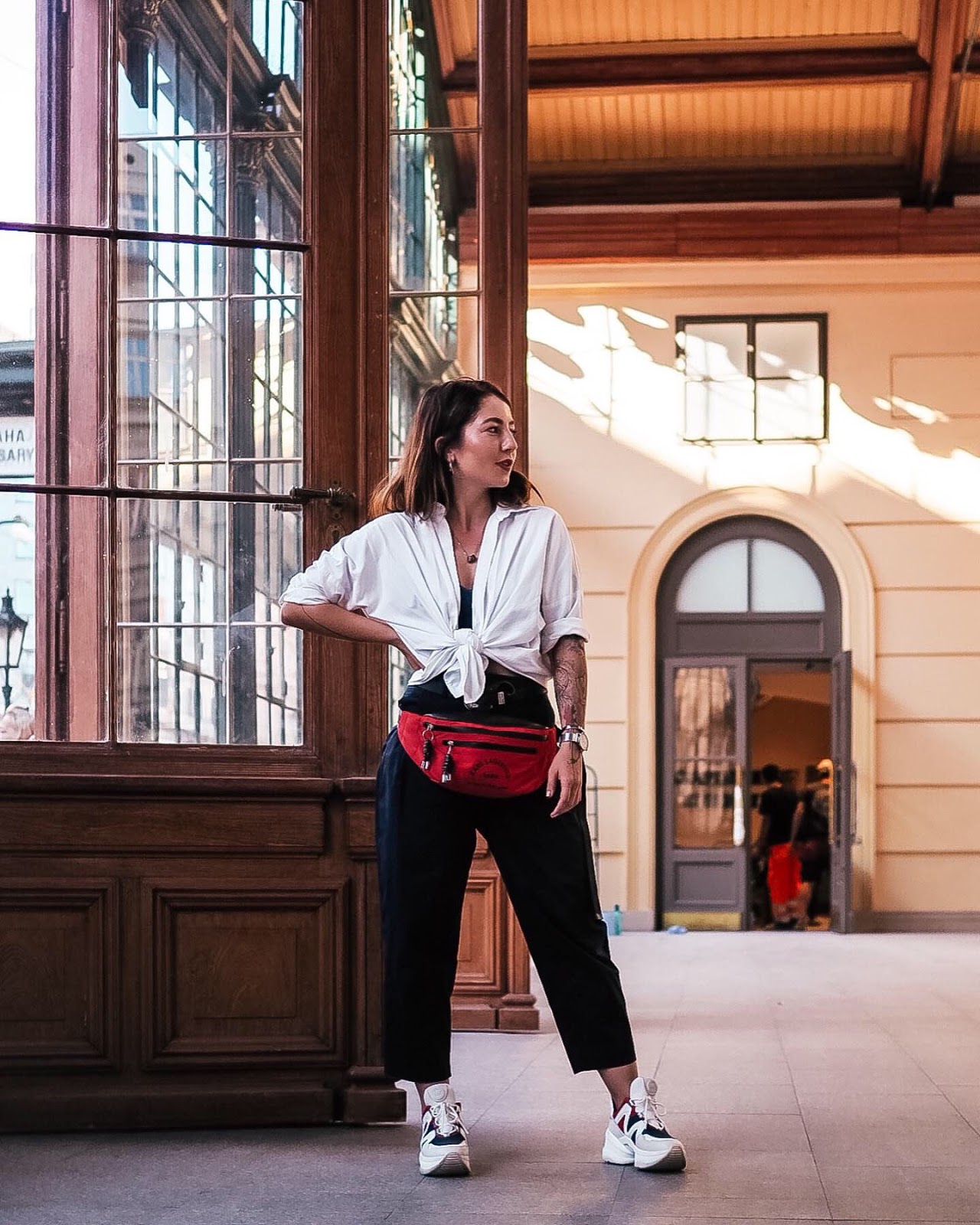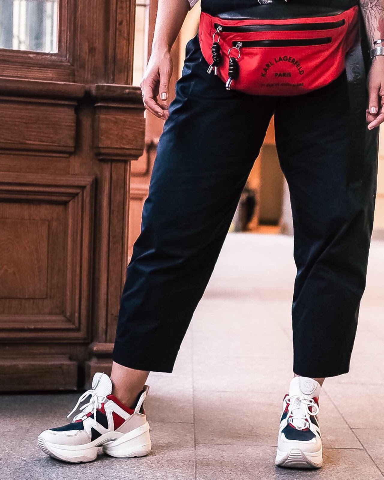Tady jsem se teda taky trošku vyřádila a zkombinovala dohromady věci, který většina lidí nenávidí. Neforemný kalhoty, obří boty a velkou neelegantní ledvinku. Že mě to strašně bavilo asi říkat nemusím, co? :)))